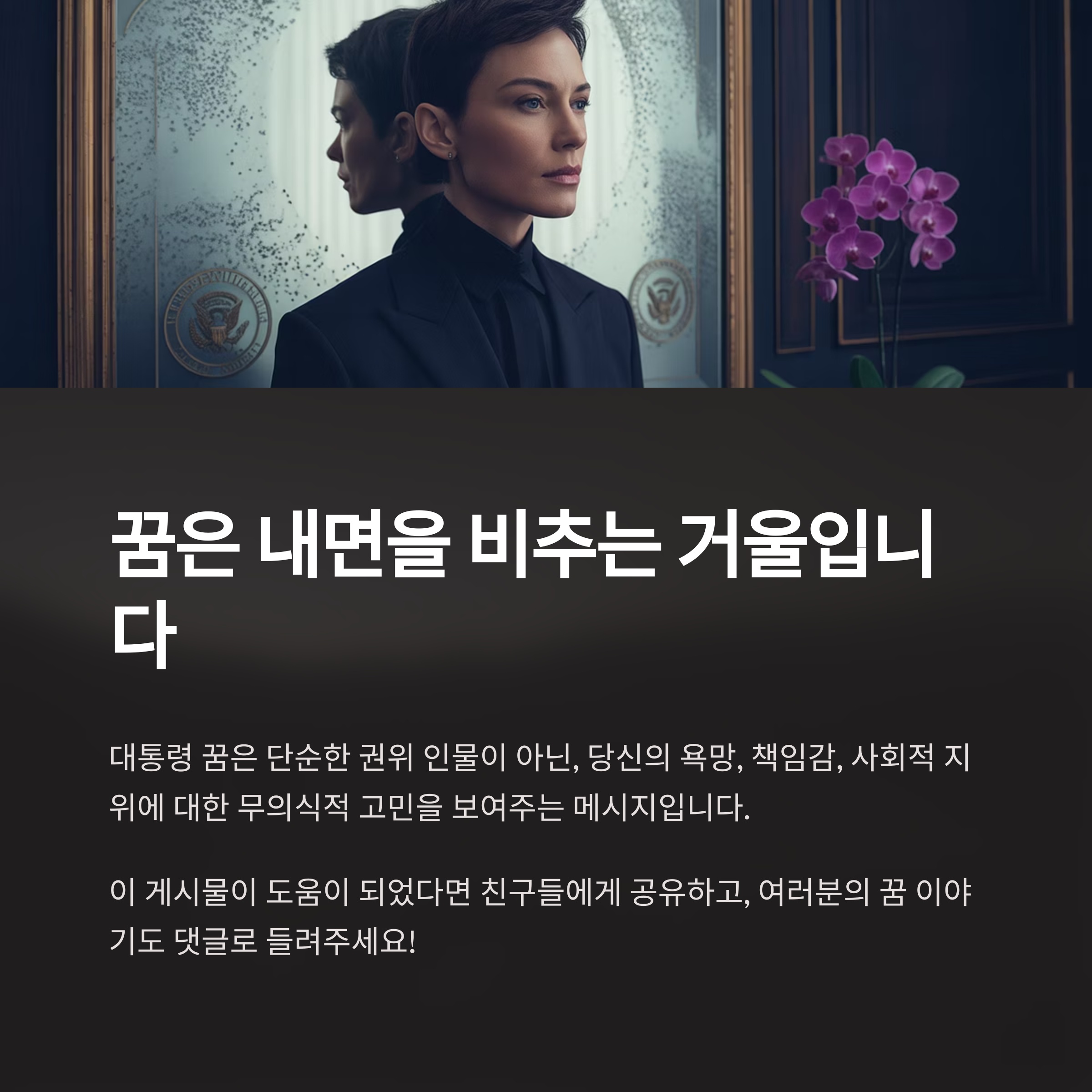 가끔은 꿈에서 너무 생생하고 웅장한 장면을 마주치게 되죠. 그중에서도 '대통령'이 나오는 꿈이라면 왠지 모르게 심장이 두근거리고, 무슨 의미일까 궁금해지기 마련입니다. 단순히 유명인 등장 꿈일 수도 있지만, 대통령이라는 상징적인 인물이 등장한 데는 분명 이유가 있습니다. 오늘은 대통령 꿈 해몽에 대해 자세히 알아보고, 상황별로 어떤 메시지를 담고 있는지 현실에 맞게 해석해보겠습니다.