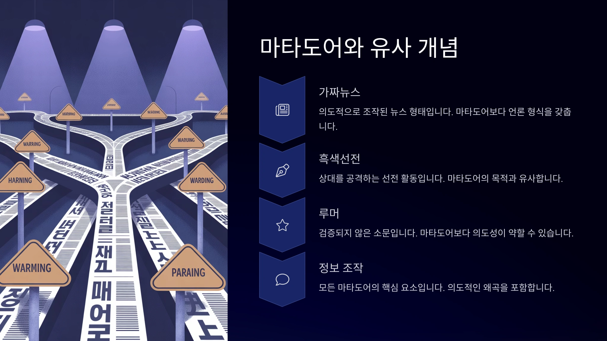 마타도어는 단순한 비판이나 의혹 제기와는 근본적으로 다릅니다. 사실에 기반한 건전한 비판은 민주 사회에 꼭 필요하지만, 마타도어는 의도적으로 사실을 왜곡하고 거짓을 꾸며내어 여론을 호도하는 행위로, 민주주의를 병들게 하는 매우 위험한 행위랍니다.