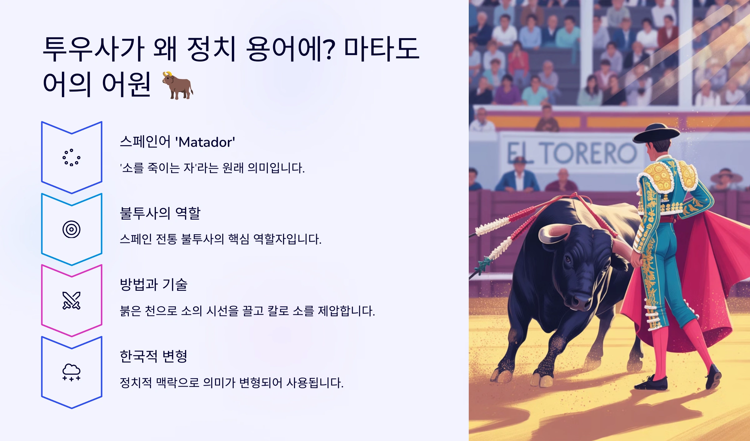 바로 이런 상황에서 우리가 자주 듣게 되는 단어가 있습니다. 바로 '마타도어(Matador)'인데요. 그냥 '상대방 헐뜯기' 정도로만 알고 계셨다면, 오늘 이 글을 통해 그보다 훨씬 더 깊고 위험한 의미를 품고 있다는 사실을 알게 되실 겁니다. 마타도어가 정확히 무엇인지, 그리고 우리 사회에 어떤 영향을 미치는지 함께 알아보아요. 😊