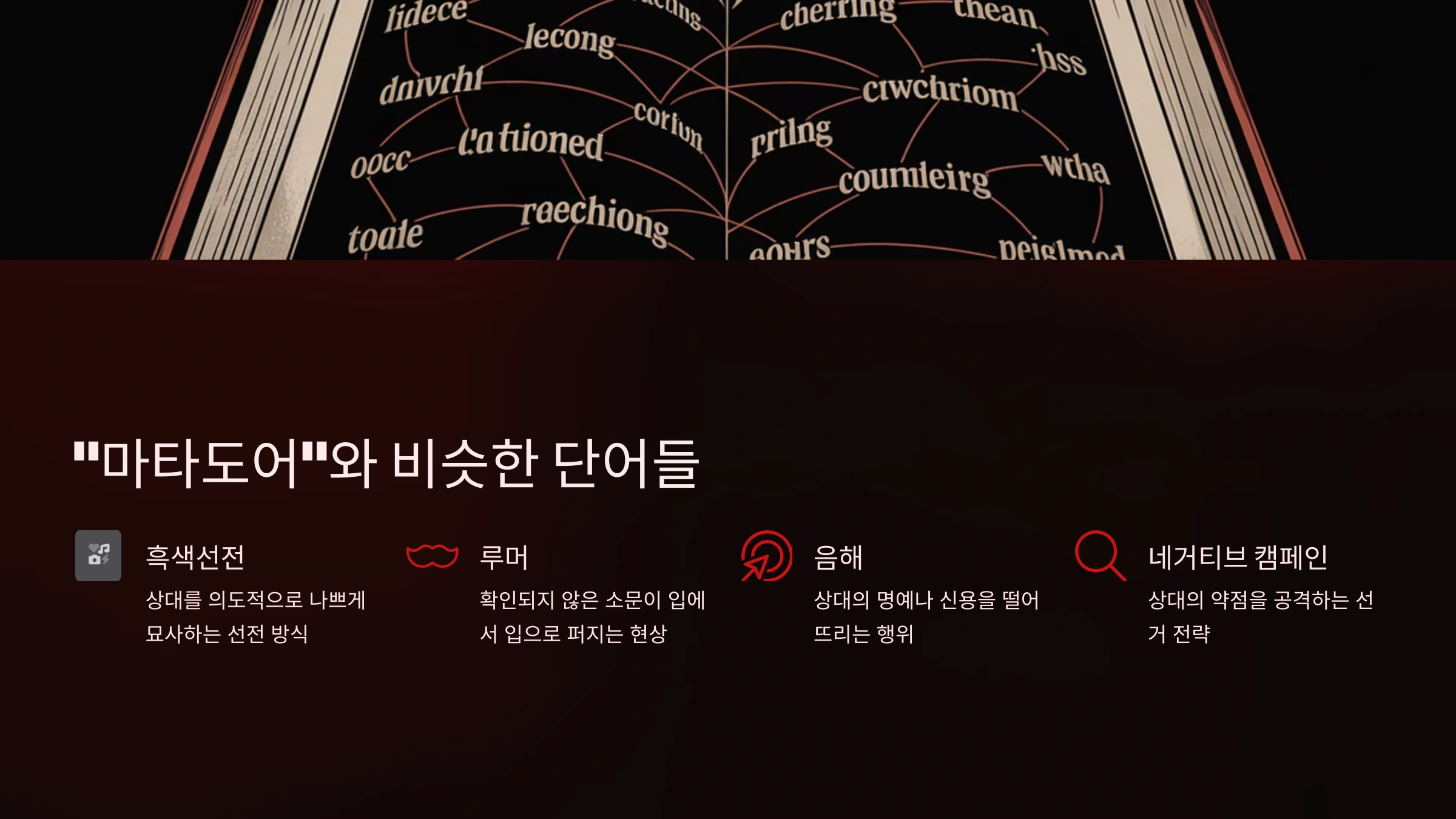 네거티브 캠페인도 과도하면 유권자들의 정치 혐오를 부추길 수 있어 비판의 대상이 되곤 합니다. 하지만 마타도어는 민주주의의 근간인 '신뢰'를 무너뜨리는 행위라는 점에서 네거티브와는 차원이 다른 문제점을 가집니다.