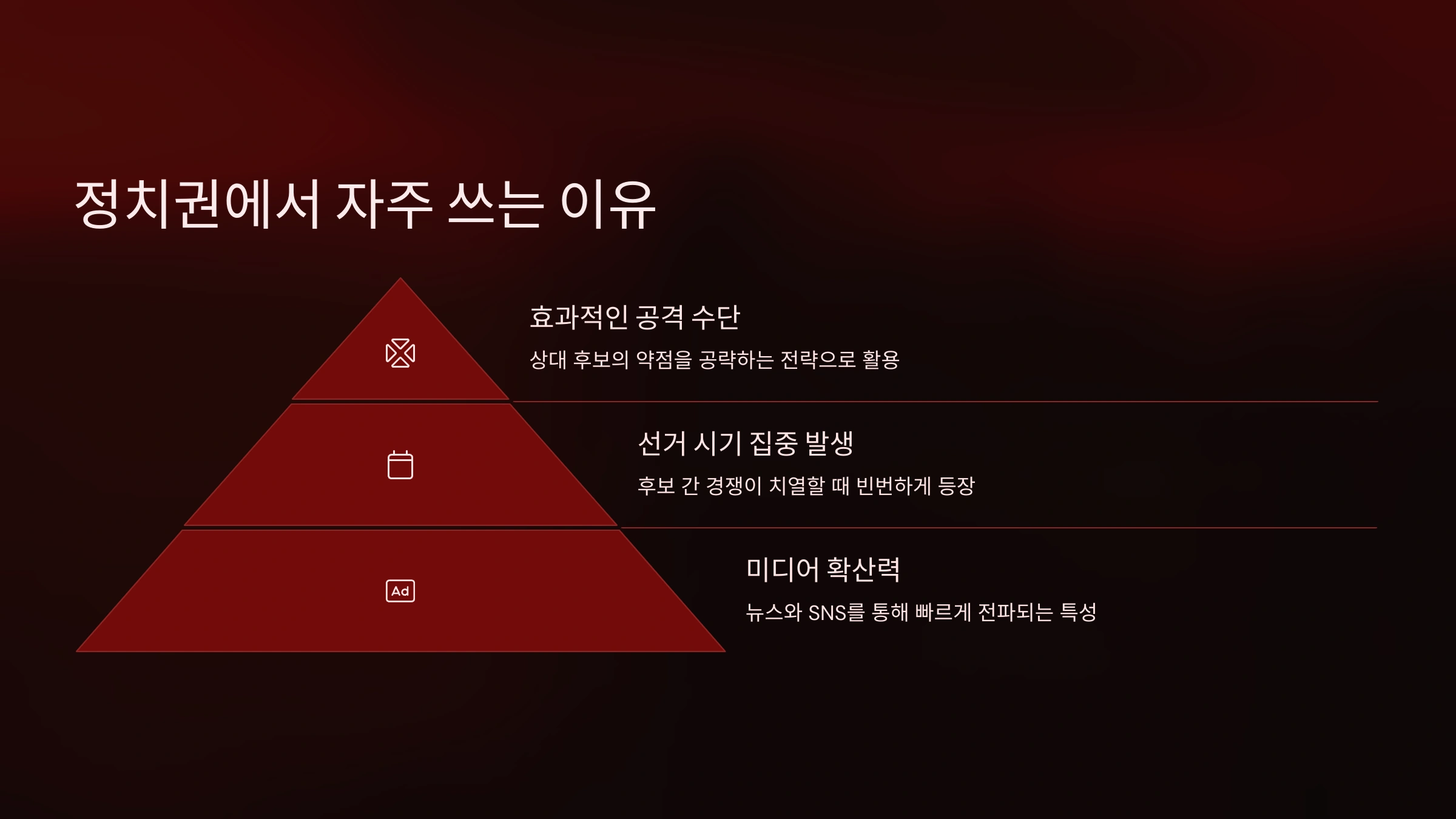 | 기반 | 거짓, 허위, 날조, 왜곡된 정보 | 사실에 기반한 정보 (정책, 과거 발언, 행적 등) |
