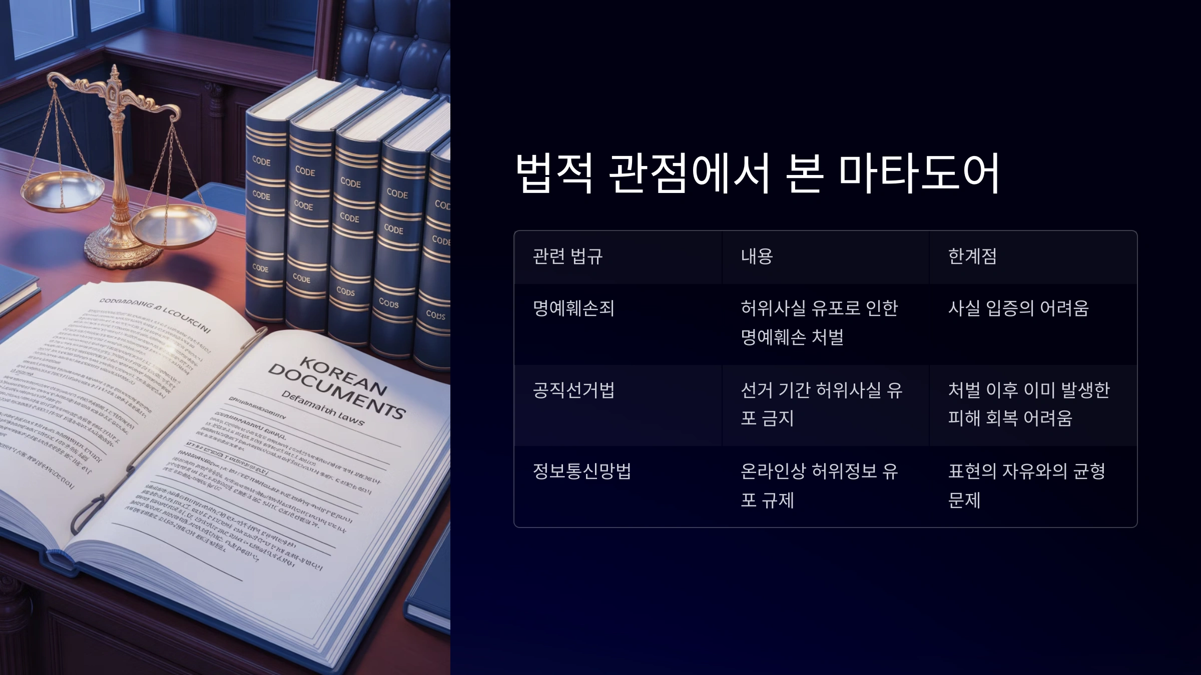 | 법적 성격 | 명백한 불법 (허위사실공표죄, 명예훼손 등) | 표현의 자유 범위 내에서 합법 (단, 과도할 경우 비판받음) |