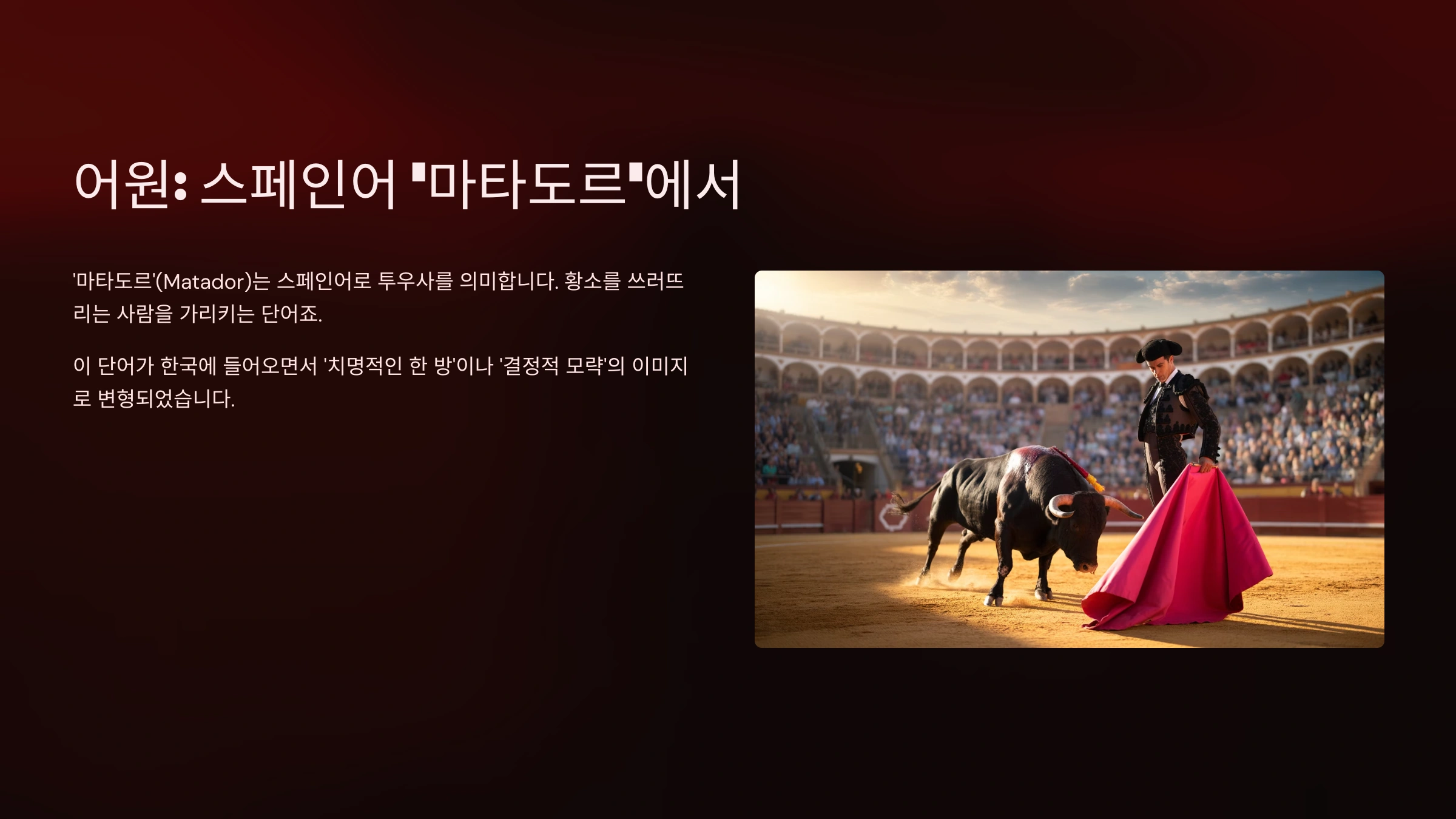 '마타도어'라는 단어, 뭔가 이국적으로 들리지 않나요? 맞습니다. 이 단어는 스페인어에서 유래했어요. 스페인의 전통 경기인 투우(鬪牛)를 보신 적 있나요? '마타도어(Matador)'는 바로 투우의 마지막 단계에서 소의 숨통을 끊는 주역, 즉 투우사를 가리키는 말입니다.