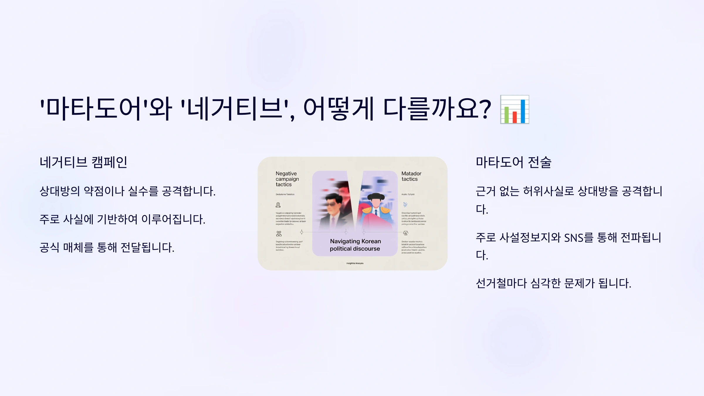| 구분 | 마타도어 (흑색선전) | 네거티브 캠페인 |