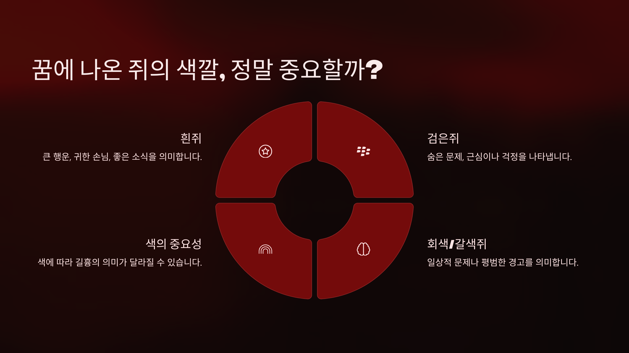 네, 아주 중요해요! 꿈에서 동물의 색은 그 꿈의 전체적인 분위기와 해석의 방향을 결정하는 핵심적인 역할을 합니다. 특히 쥐 꿈에서는 색깔이 길흉을 가르는 결정적인 단서가 될 수 있어요.