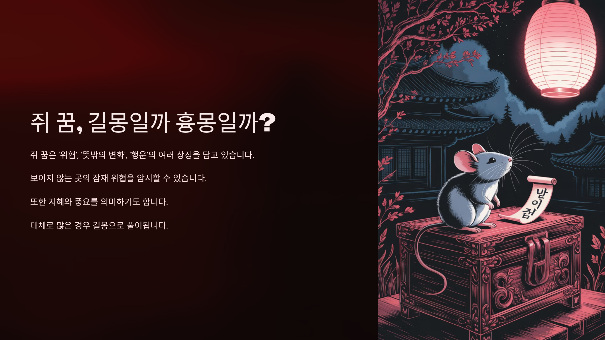 그래서 오늘은 저처럼 뜬금없는 쥐의 등장에 마음 졸였을 분들을 위해, 쥐 꿈 해몽을 제대로 한번 파헤쳐 보려고 해요. 사실 쥐 꿈은 우리가 생각하는 것보다 훨씬 더 다양하고 깊은 의미를 담고 있다고 해요. 재물과 행운의 상징이 되기도 하고, 때로는 우리에게 경고의 메시지를 보내기도 하죠. 지금부터 저와 함께 2025년 최신판 쥐 꿈 해몽의 세계로 떠나볼까요? 🚀