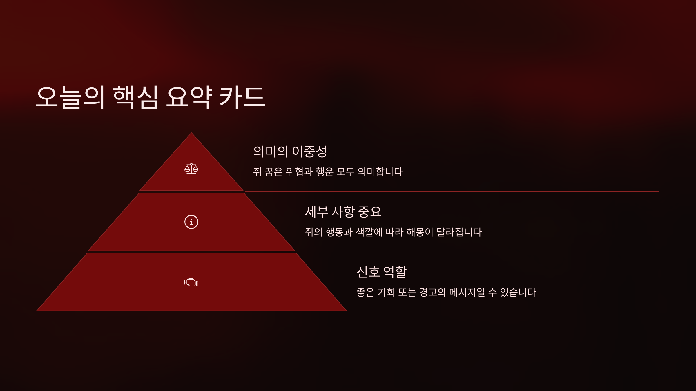 지금까지 쥐 꿈에 대해 정말 많은 이야기를 나눴는데요, 머릿속이 복잡하신 분들을 위해 핵심만 쏙쏙 뽑아 한눈에 볼 수 있는 카드로 정리해 봤어요!
