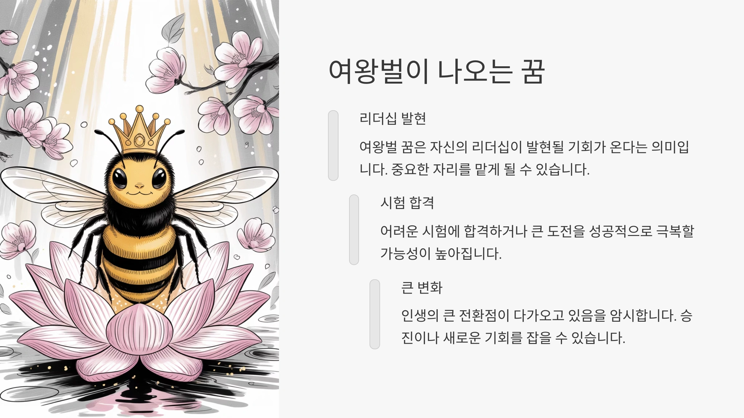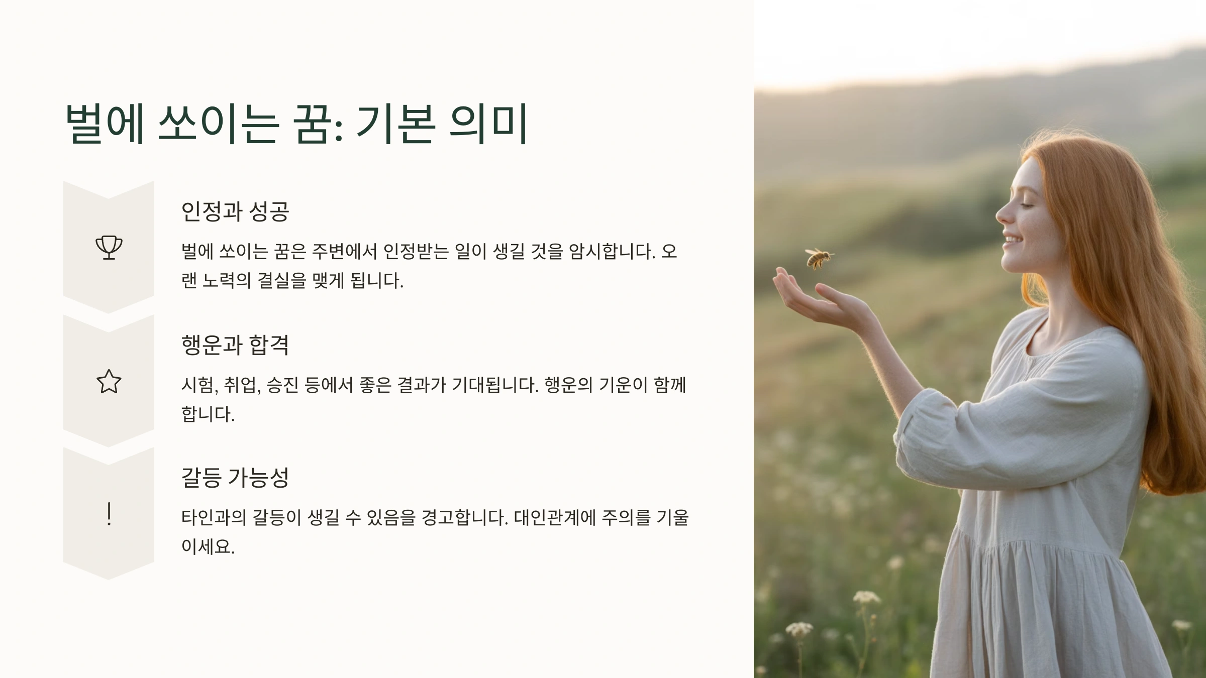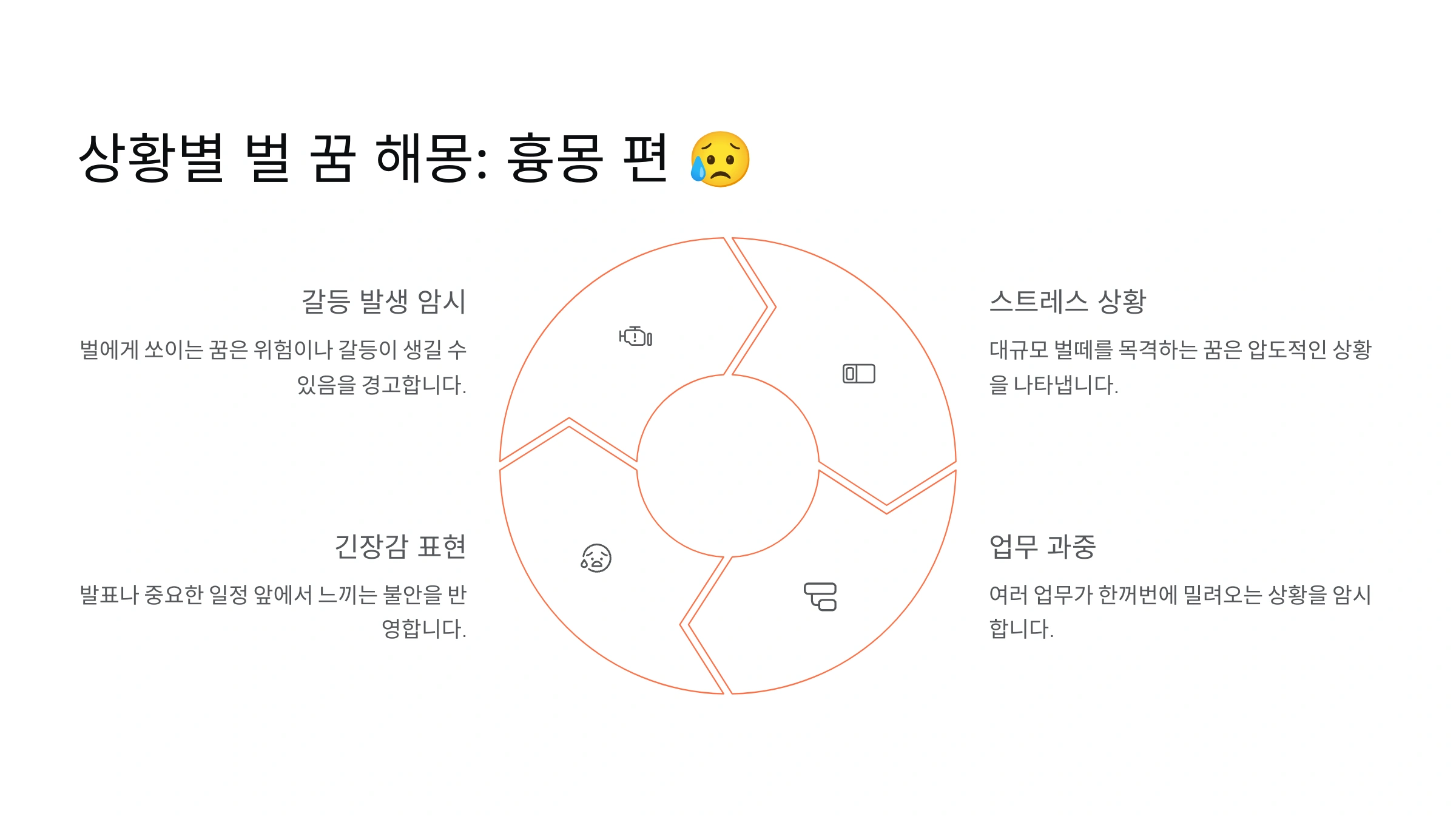 - 부정적 의미 (흉몽): 반대로 벌의 날카로운 침, 공격성, 윙윙거리는 소리는 방해물, 구설수, 질병, 스트레스, 인간관계의 갈등을 나타내기도 해요. 꿈의 전체적인 분위기와 나의 감정이 어땠는지가 해석에 큰 영향을 미칩니다.