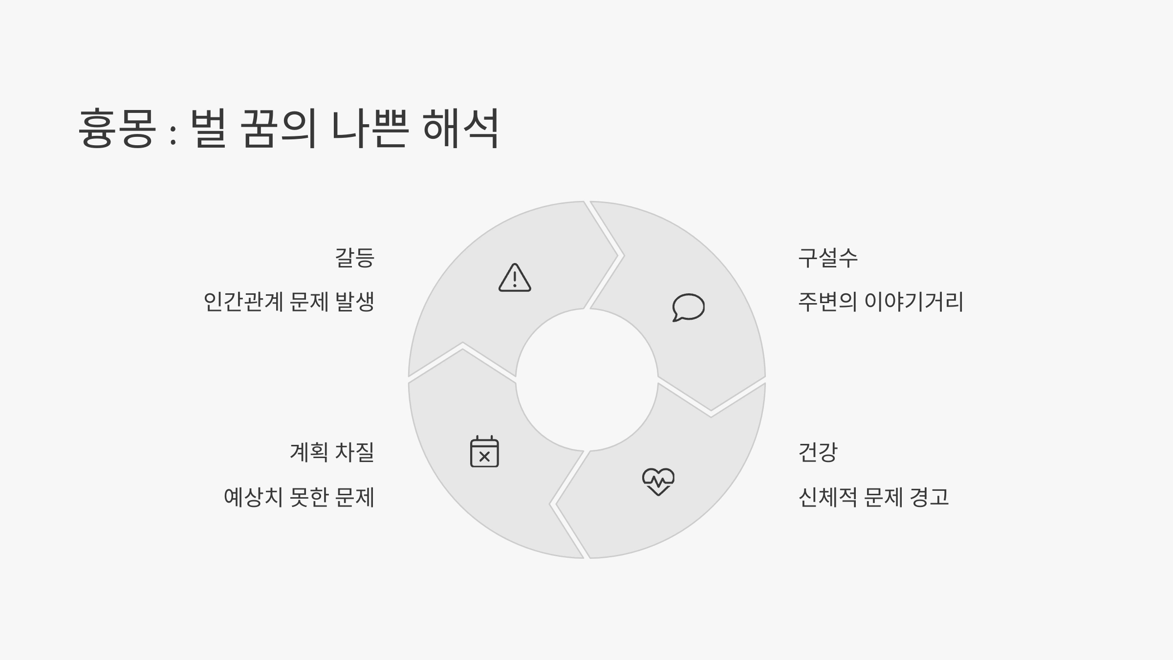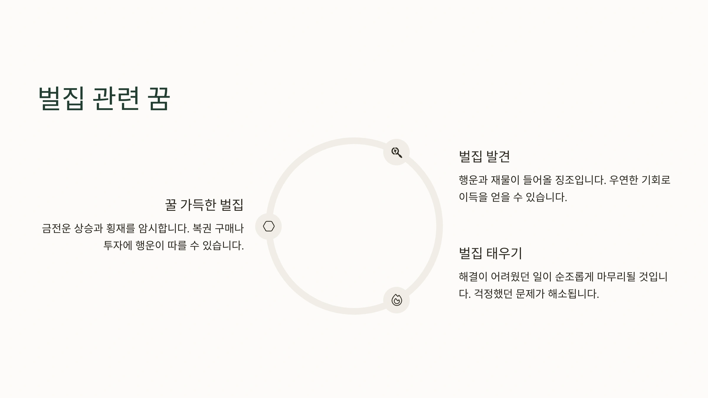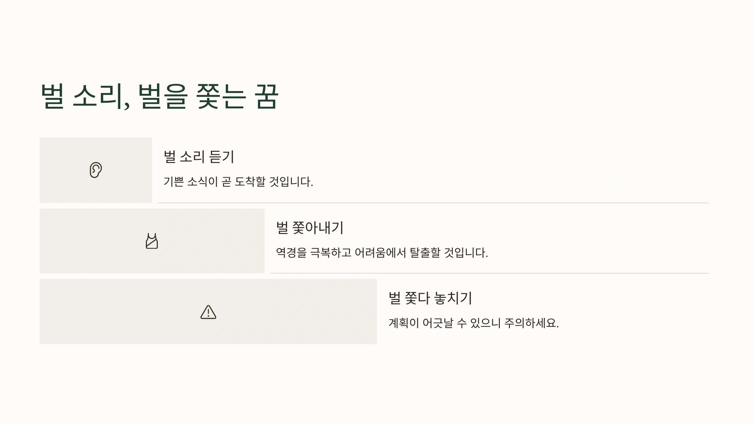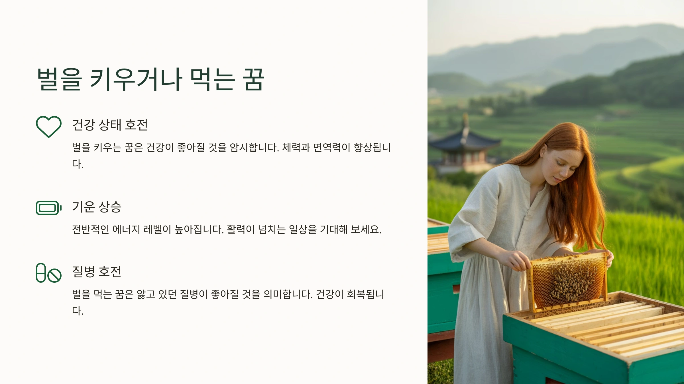 - 부정적 의미 (흉몽): 반대로 벌의 날카로운 침, 공격성, 윙윙거리는 소리는 방해물, 구설수, 질병, 스트레스, 인간관계의 갈등을 나타내기도 해요. 꿈의 전체적인 분위기와 나의 감정이 어땠는지가 해석에 큰 영향을 미칩니다.