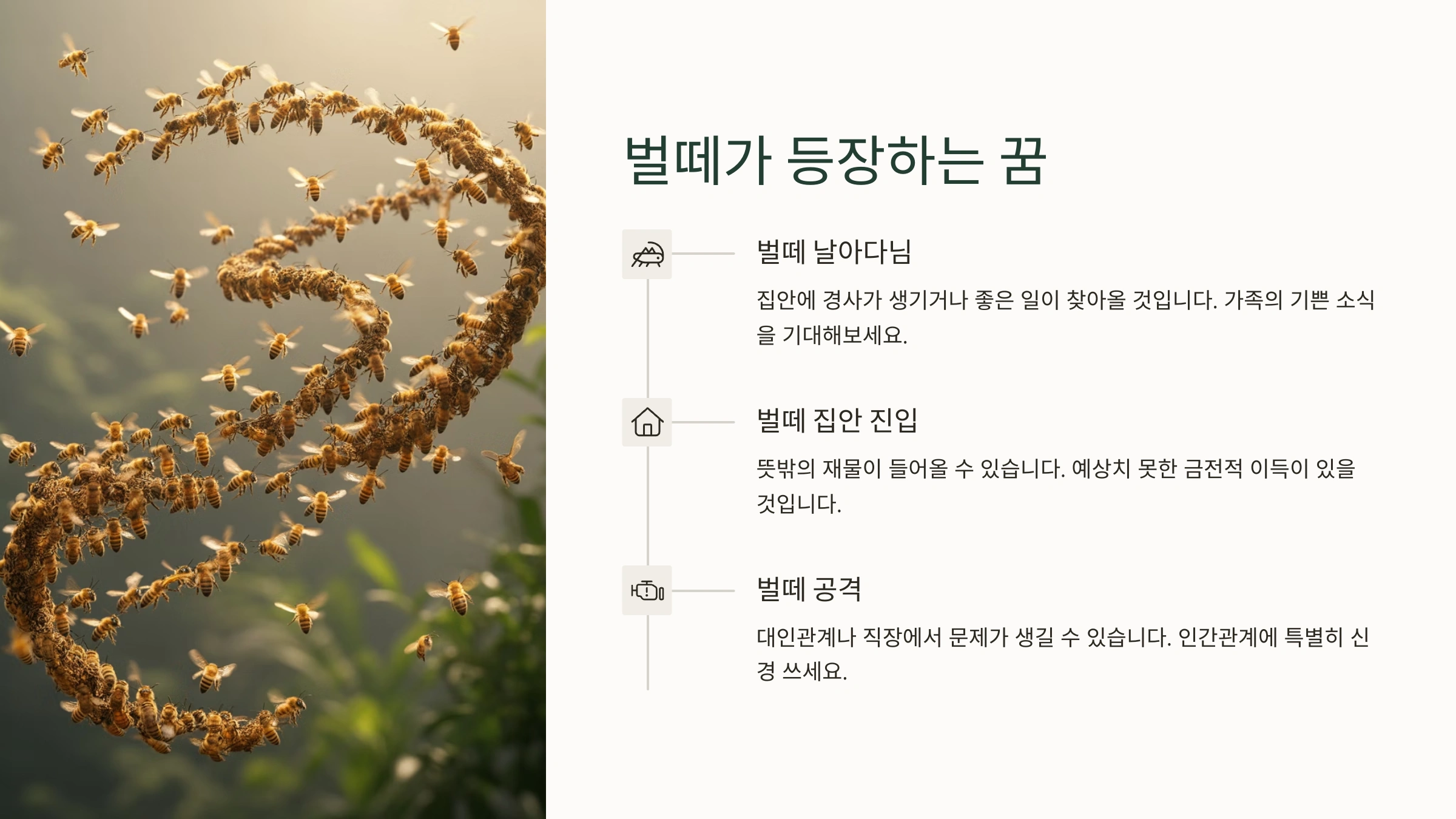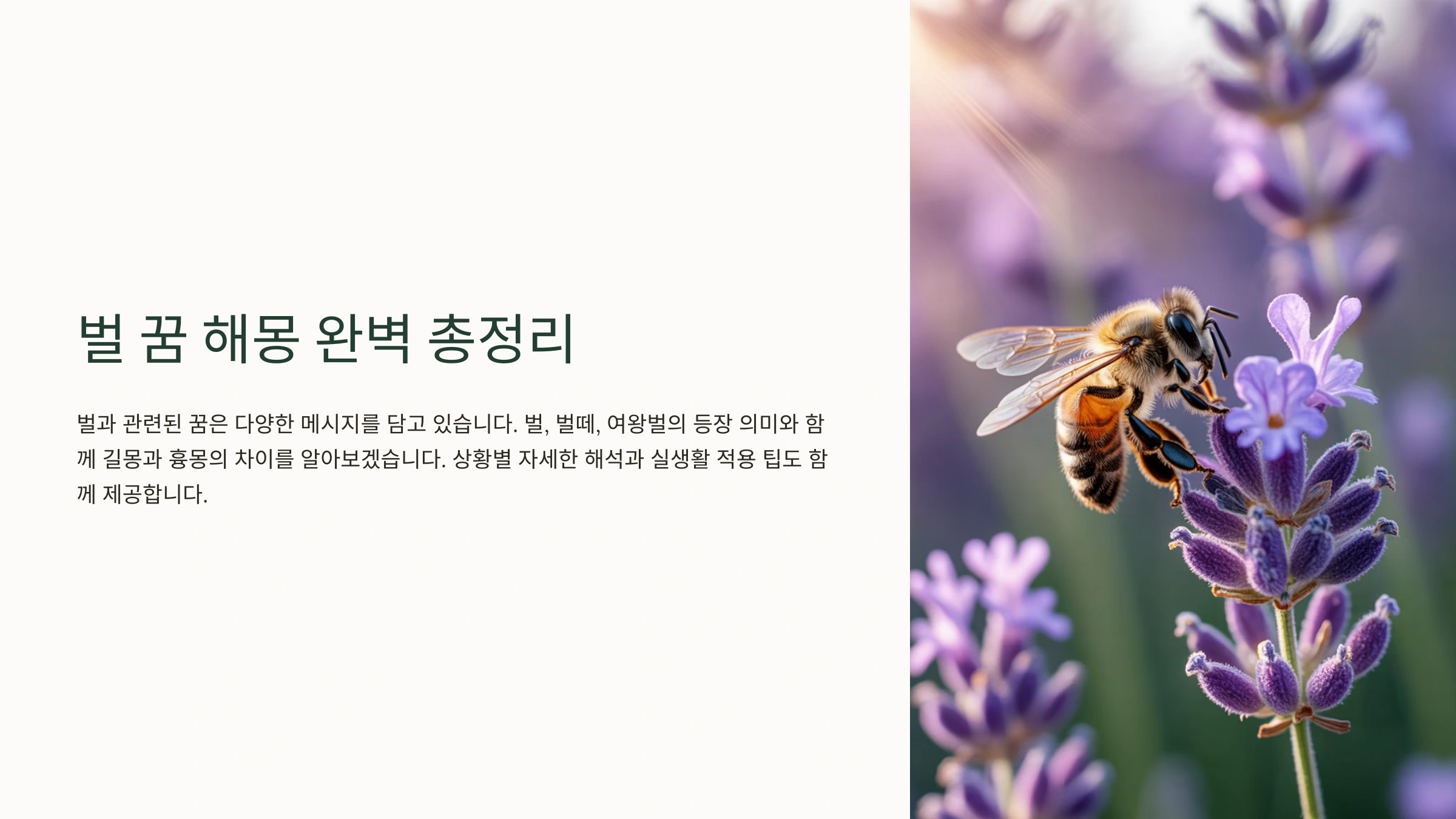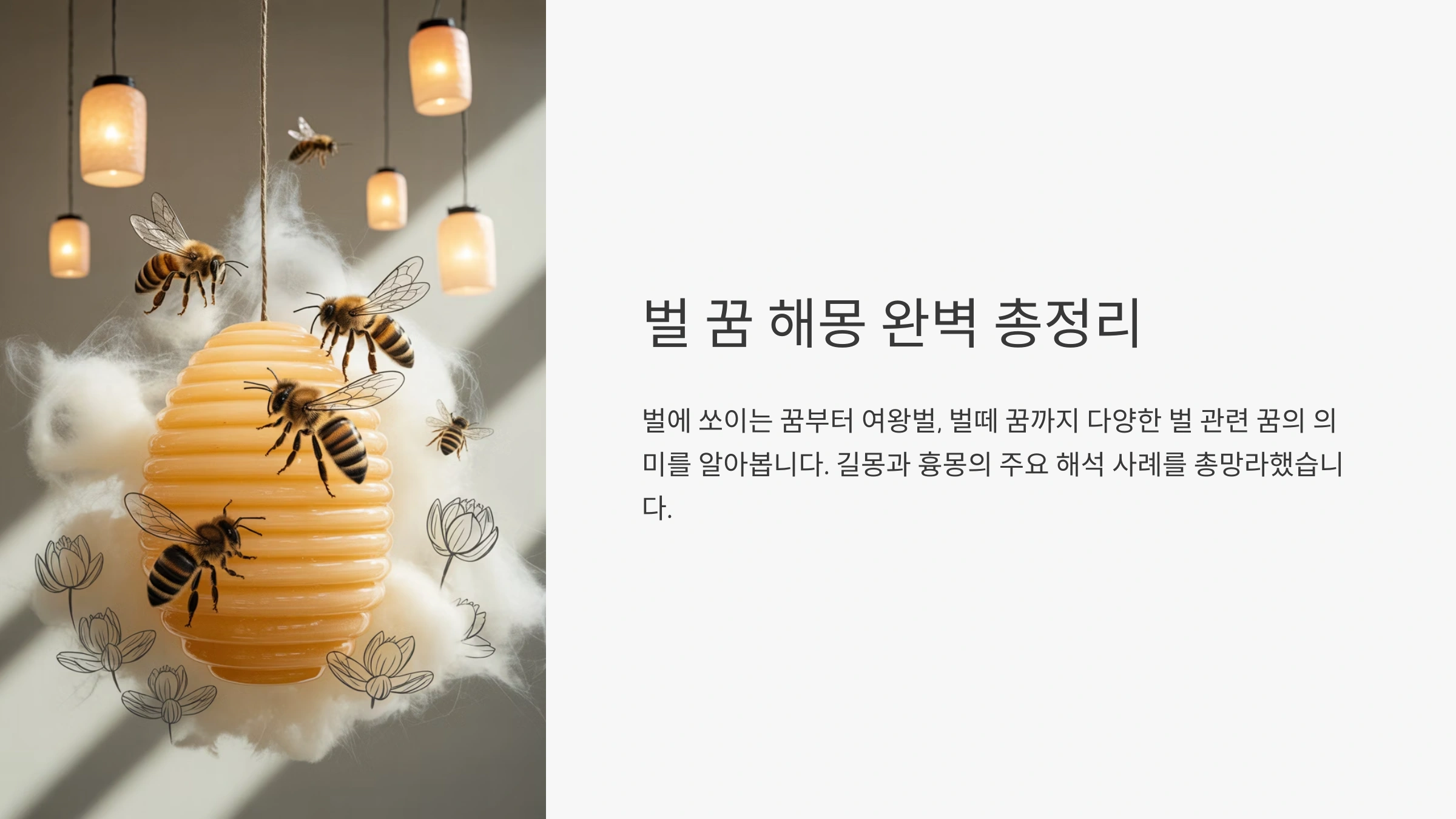 안녕하세요! 며칠 전 공원을 산책하는데 커다란 꿀벌 한 마리가 제 주변을 맴돌더라고요. 무섭다기보다는 어쩐지 신기한 느낌이었는데, 그날 밤 꿈에 정말 생생하게 벌떼가 나타난 거 있죠? 🐝 잠에서 깨자마자 '이거 무슨 꿈이지?' 싶어서 온종일 신경이 쓰였답니다. 아마 저처럼 꿈에 나타난 벌 때문에 마음이 궁금하고 복잡했던 경험, 다들 있으실 거예요. 벌은 예로부터 부와 다산, 성실함과 조직력을 상징하기도 하지만, 때로는 날카로운 침을 가진 위협적인 존재로 여겨지기도 하잖아요? 그래서 오늘은 2025년 최신 해석을 바탕으로, 다양한 상황별 벌 꿈 해몽을 완벽하게 파헤쳐 드리려고 합니다. 함께 꿈의 비밀을 풀어봐요! 😊