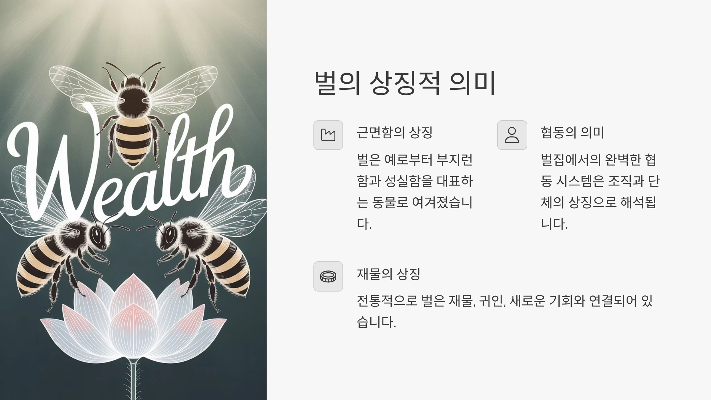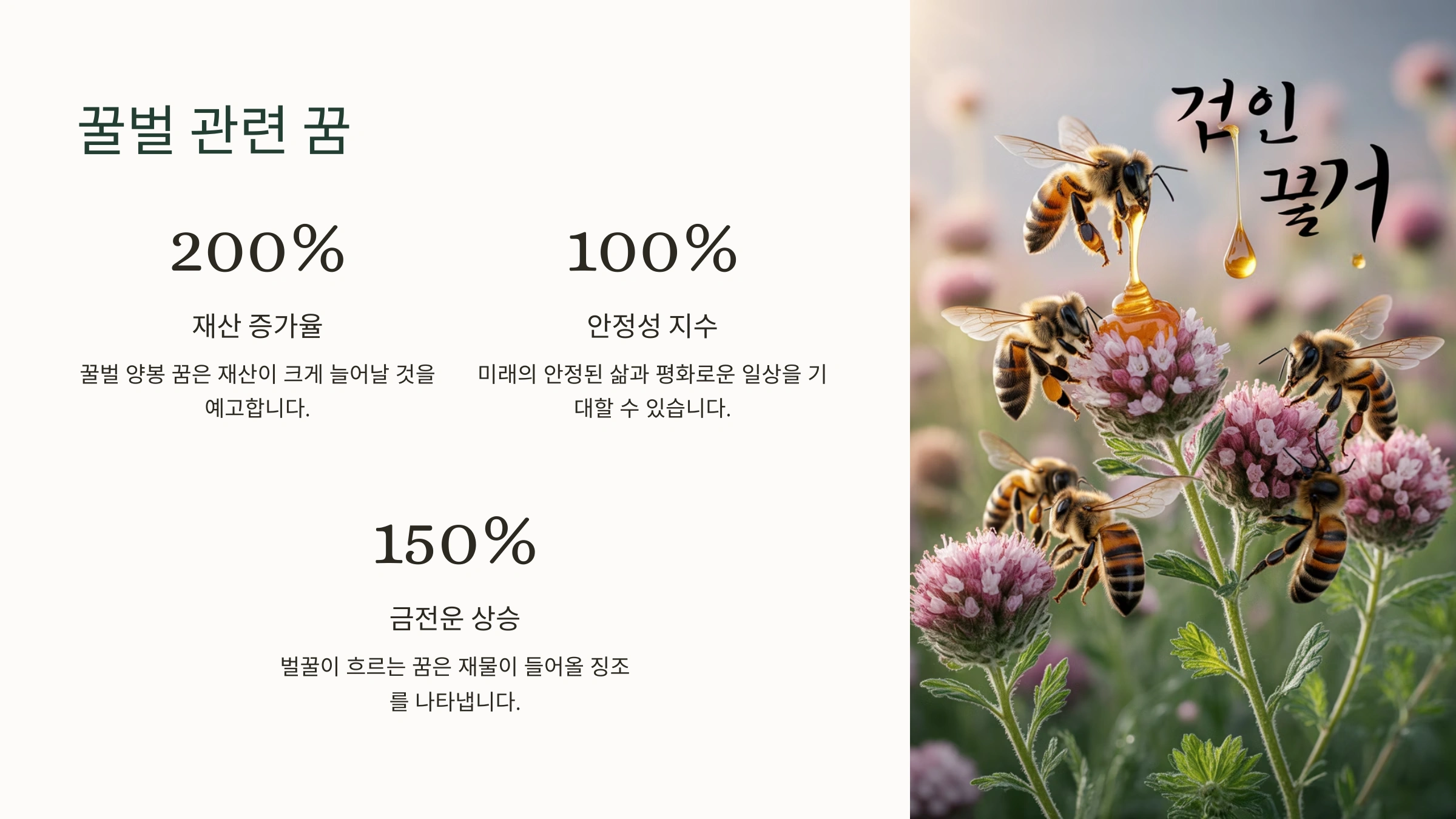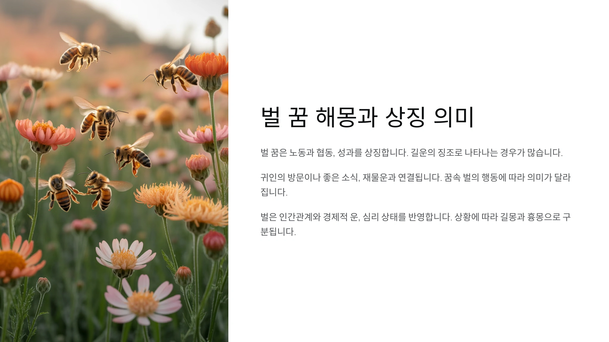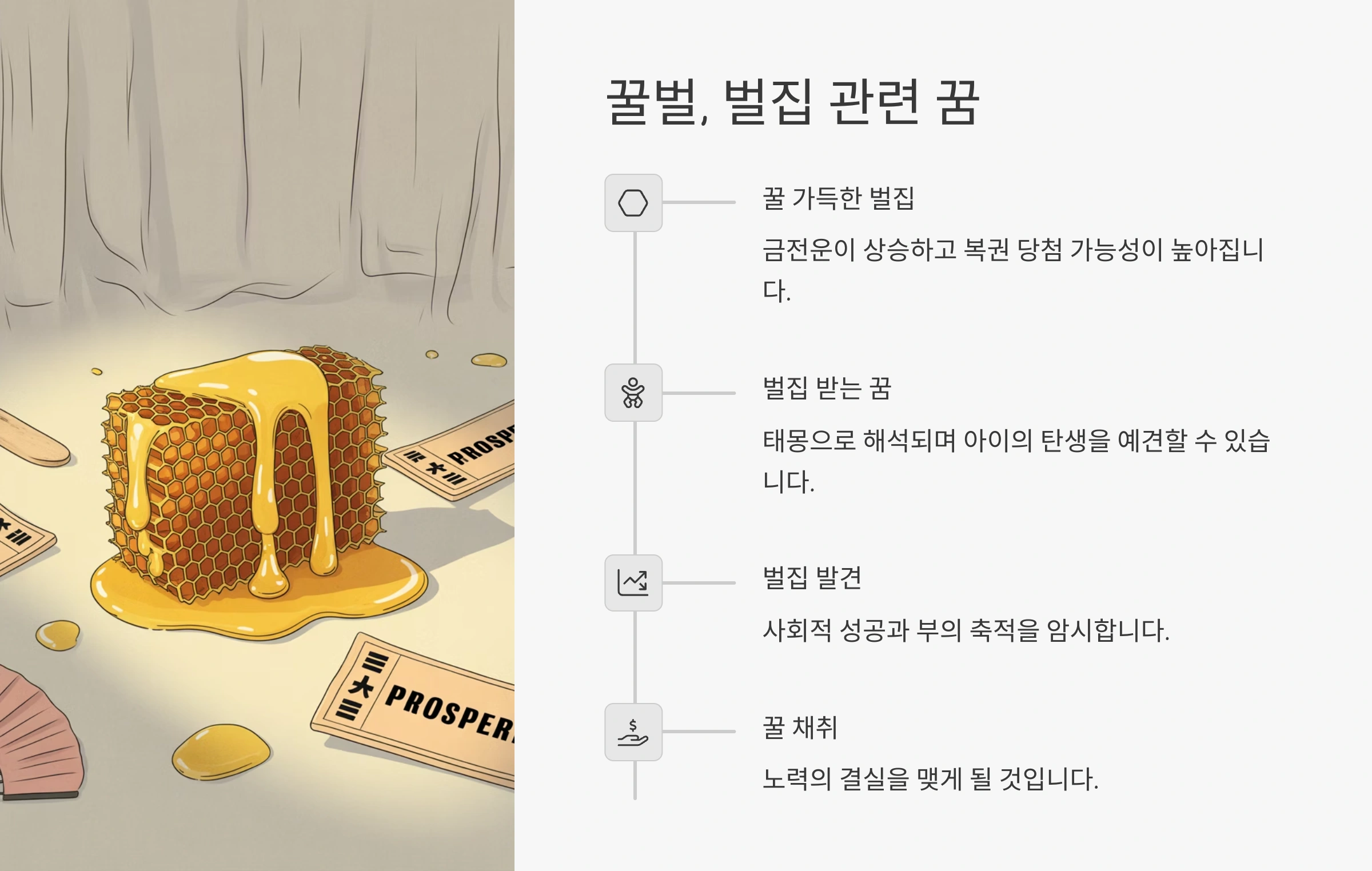 안녕하세요! 며칠 전 공원을 산책하는데 커다란 꿀벌 한 마리가 제 주변을 맴돌더라고요. 무섭다기보다는 어쩐지 신기한 느낌이었는데, 그날 밤 꿈에 정말 생생하게 벌떼가 나타난 거 있죠? 🐝 잠에서 깨자마자 '이거 무슨 꿈이지?' 싶어서 온종일 신경이 쓰였답니다. 아마 저처럼 꿈에 나타난 벌 때문에 마음이 궁금하고 복잡했던 경험, 다들 있으실 거예요. 벌은 예로부터 부와 다산, 성실함과 조직력을 상징하기도 하지만, 때로는 날카로운 침을 가진 위협적인 존재로 여겨지기도 하잖아요? 그래서 오늘은 2025년 최신 해석을 바탕으로, 다양한 상황별 벌 꿈 해몽을 완벽하게 파헤쳐 드리려고 합니다. 함께 꿈의 비밀을 풀어봐요! 😊
