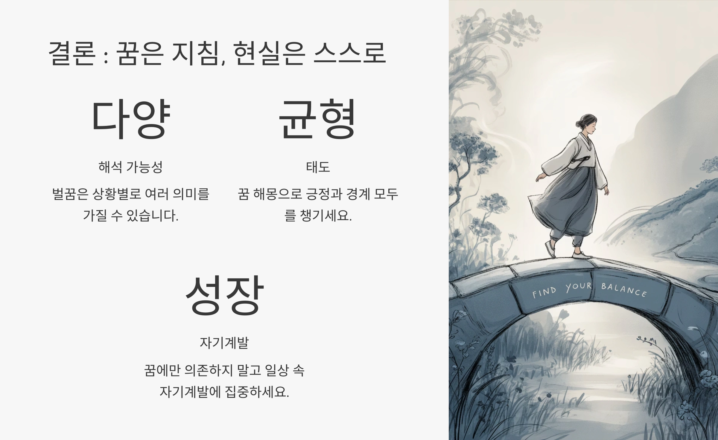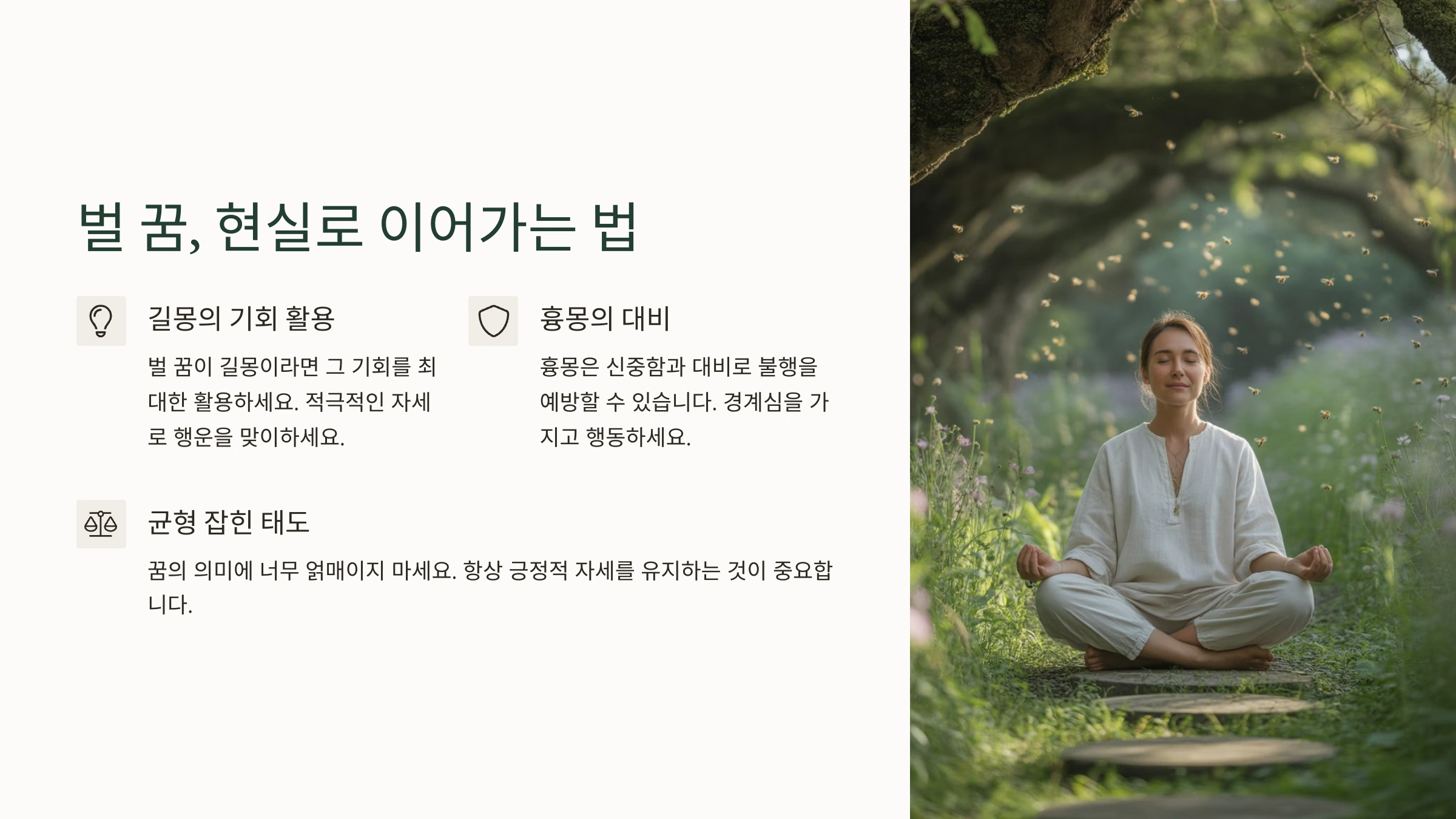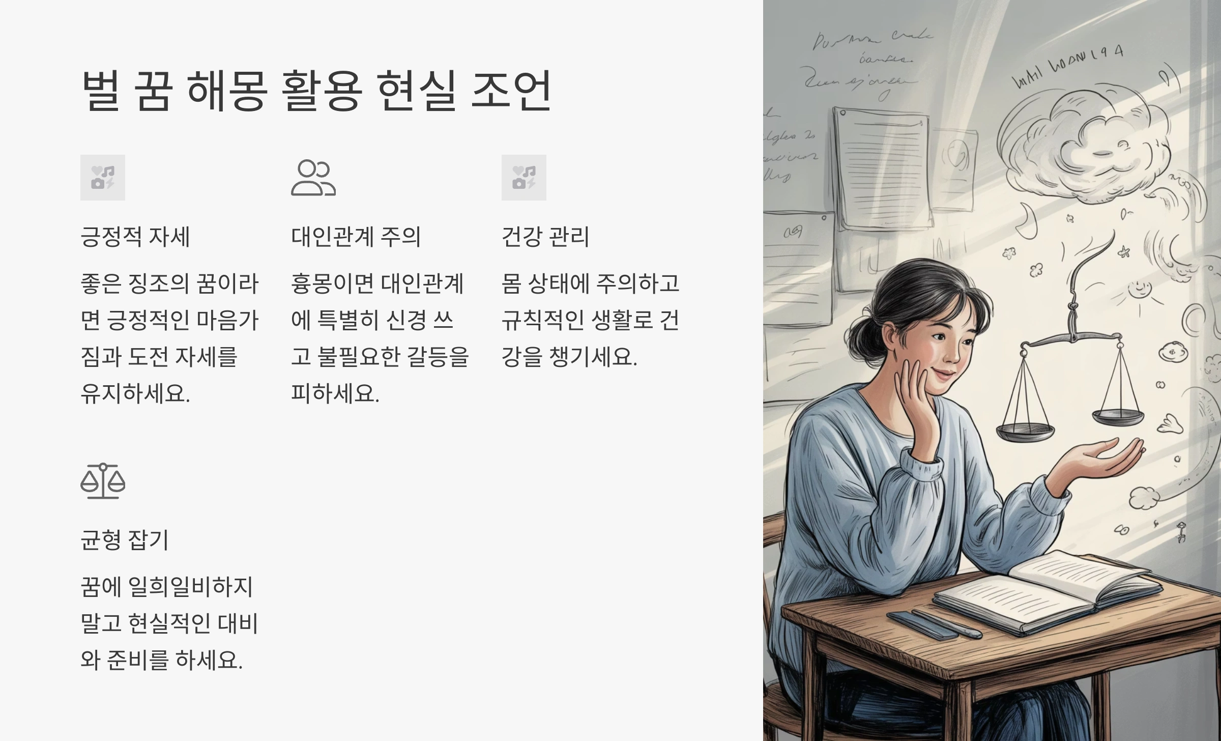 꿈 해몽은 절대적인 미래 예언이라기보다는, 현재 나의 심리 상태나 앞으로 나아갈 방향에 대한 조언으로 받아들이는 것이 좋아요. 벌 꿈을 꾸셨다면 오늘 알려드린 해몽을 참고해서 앞으로의 삶을 더 지혜롭게 만들어가시길 바랍니다. 더 궁금한 꿈 이야기가 있다면 댓글로 남겨주세요! 😊