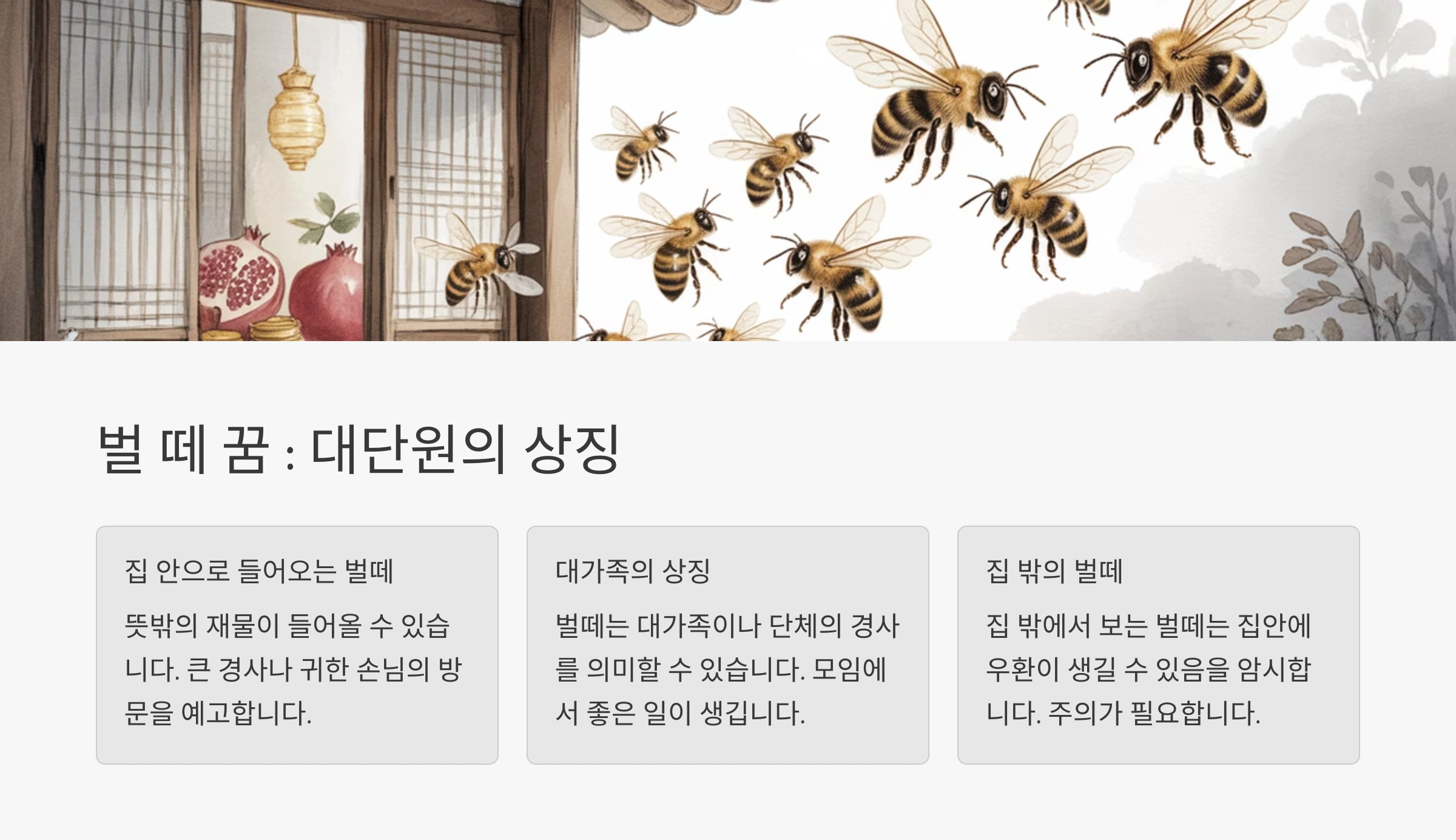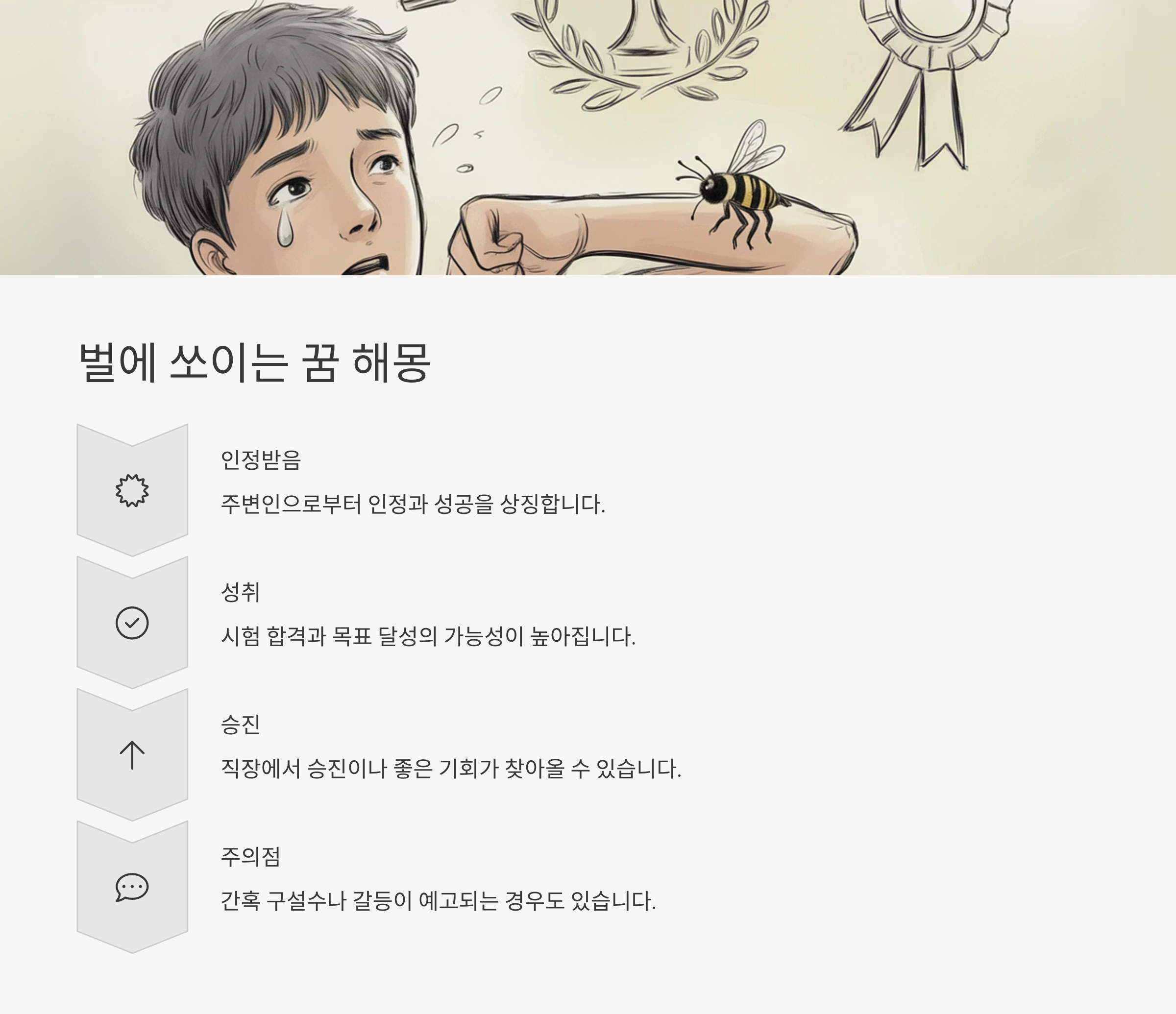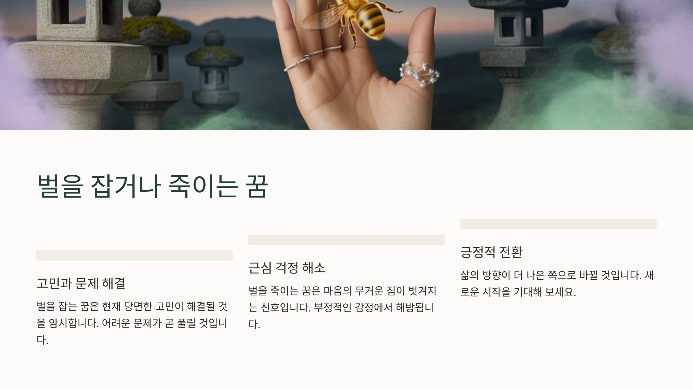 | 벌 죽이는 꿈 | 오랫동안 나를 괴롭히던 문제나 방해꾼이 사라지고 일이 순조롭게 풀릴 징조입니다. 하지만 꿀벌을 죽였다면 재물의 손실을 의미하기도 해 양면성을 가집니다. |
