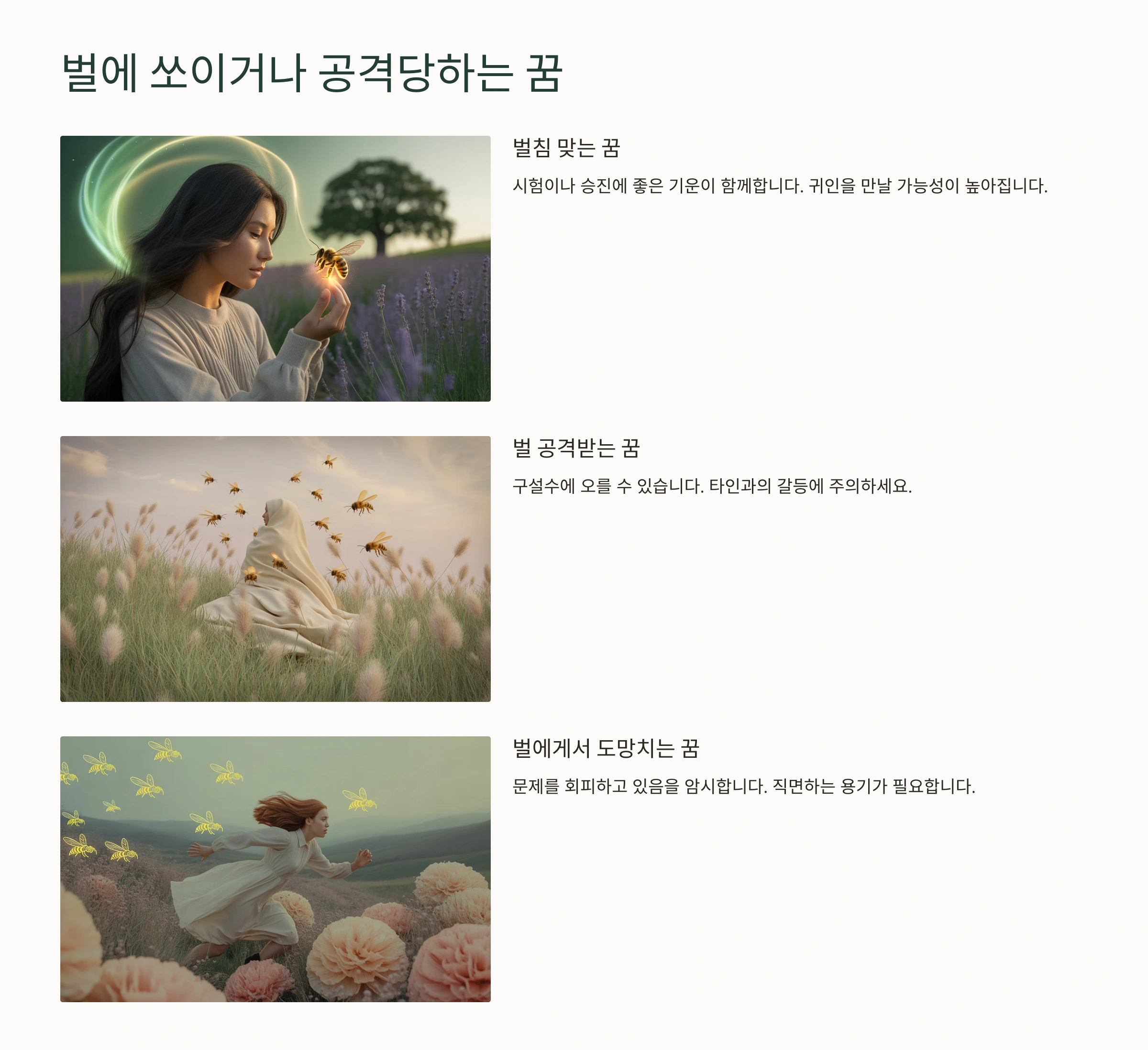 | 벌이 꽃에 앉는 꿈 | 연애운 상승! 사랑하는 연인이 생기거나, 현재의 연인과 관계가 더욱 깊어질 것을 암시하는 로맨틱한 꿈입니다. 집안에 경사가 생길 수도 있어요. |