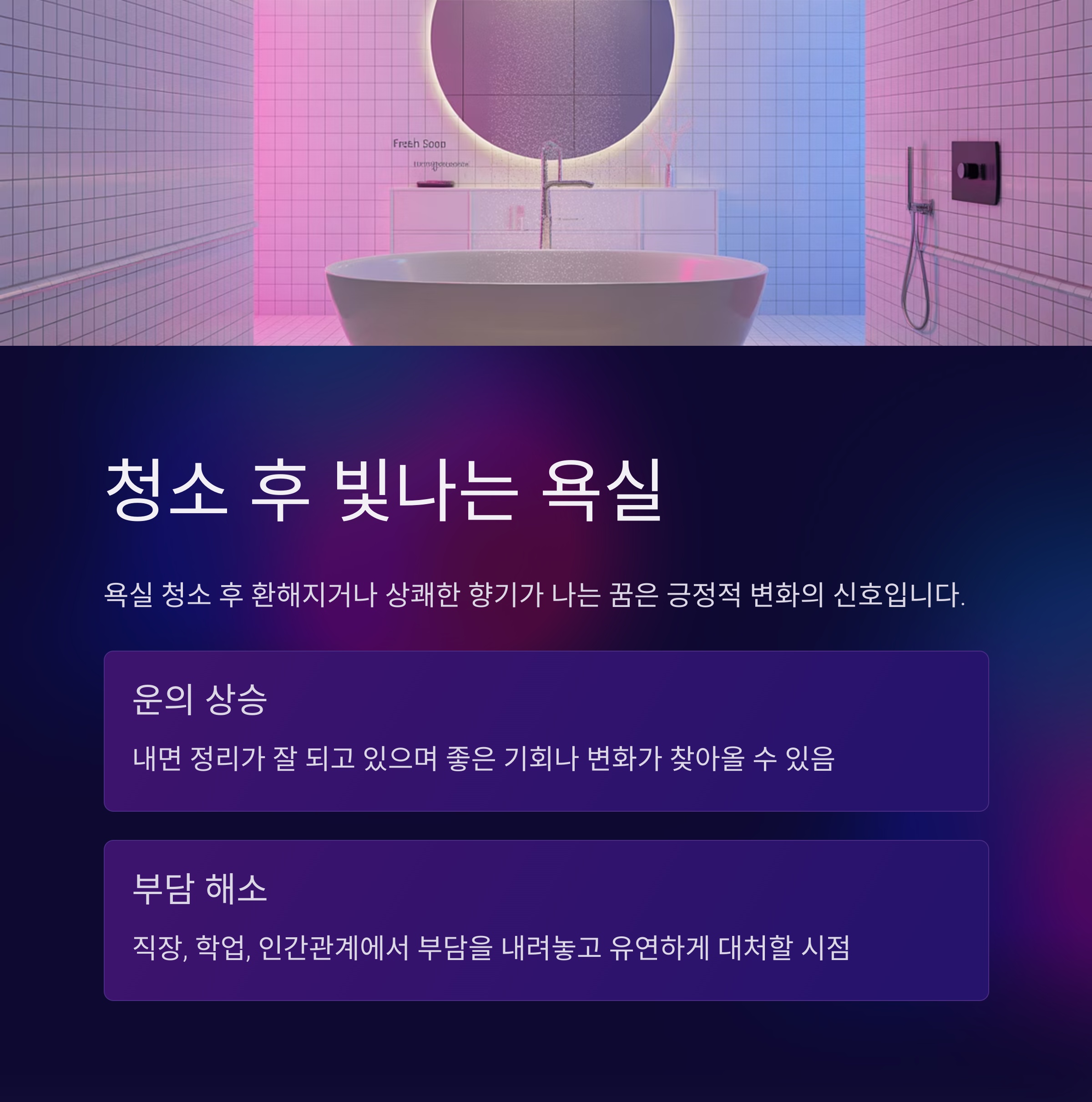 | 욕실 청소 후 기분이 좋음 | 감정 정화, 새로운 시작 |