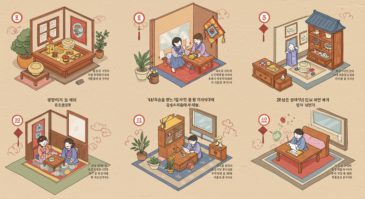 - 불필요한 물건 정리: 묵은 기운을 내보내고 새로운 기운을 맞이할 공간을 만드세요.