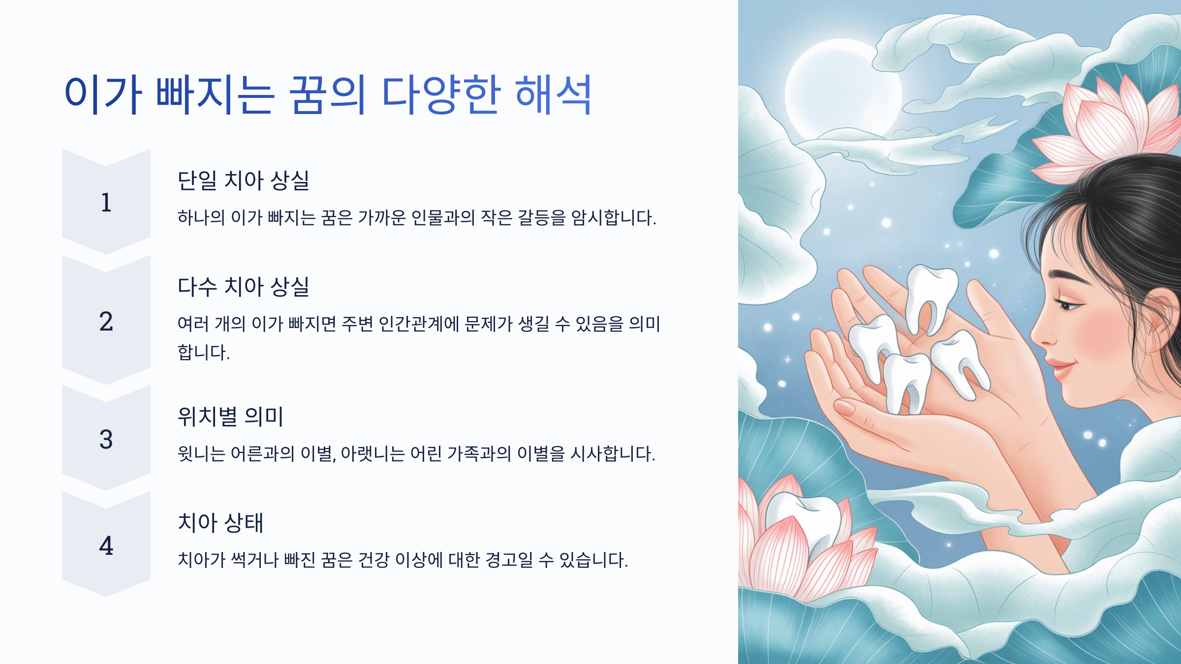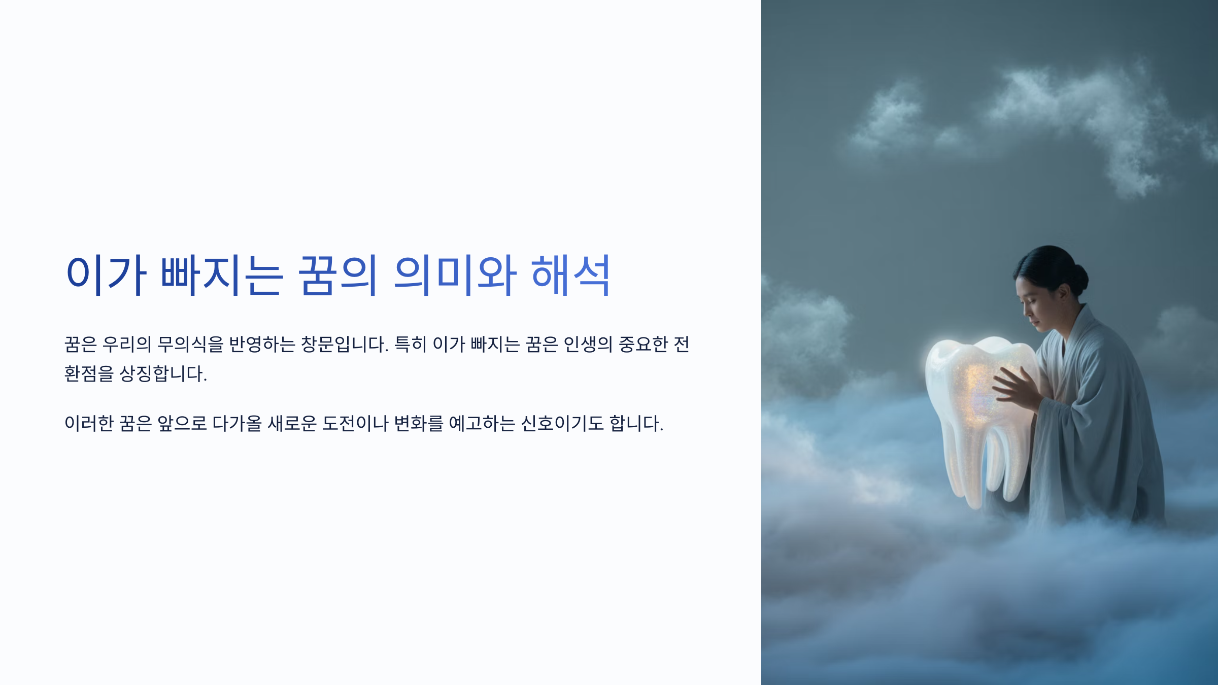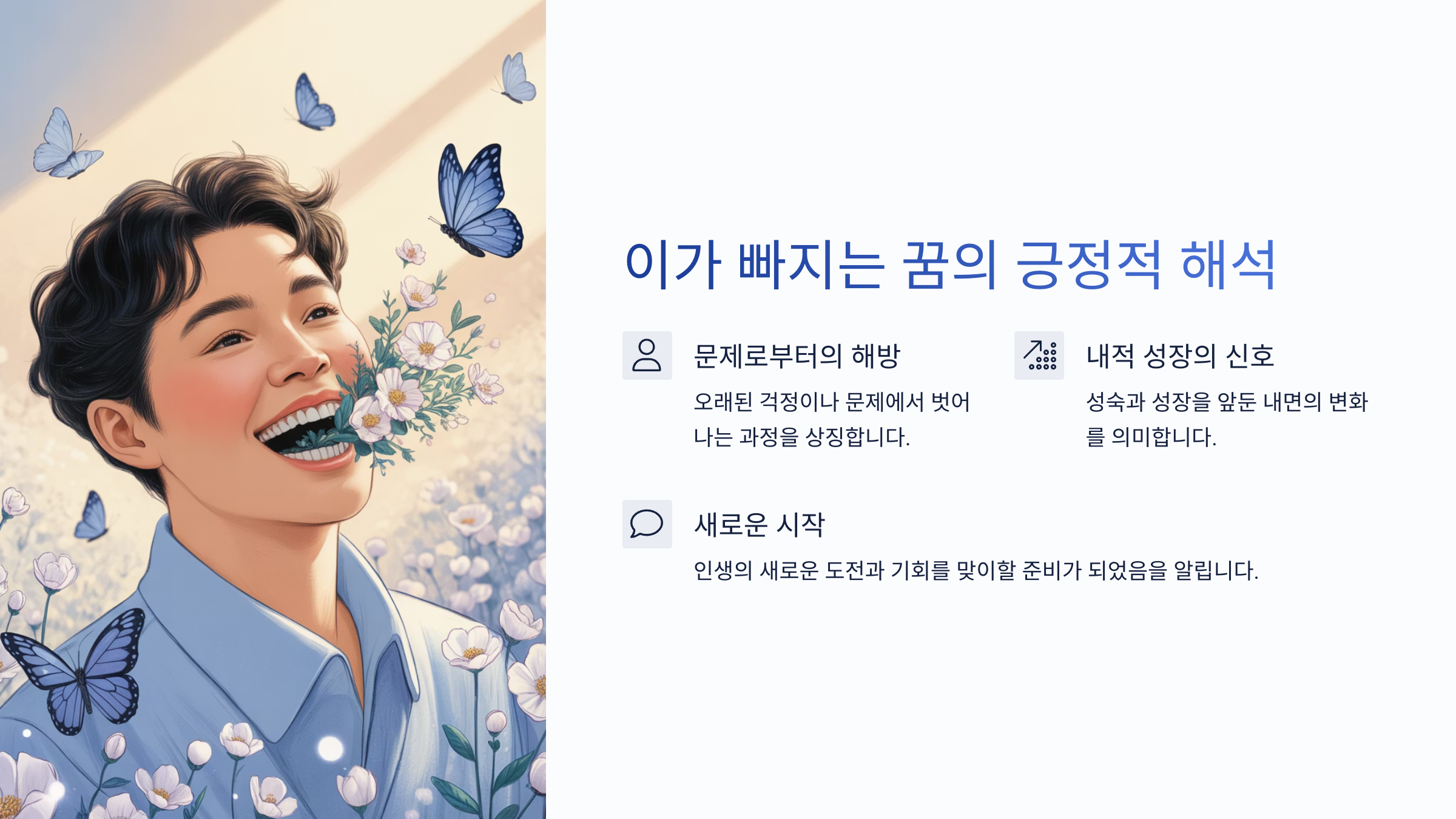 이가 빠지는 꿈은 여러 가지 해석이 가능해요. 때로는 불안, 스트레스, 건강 상태를 암시하거나 반대로 새로운 시작이나 성장의 의미로 해석되기도 한답니다.