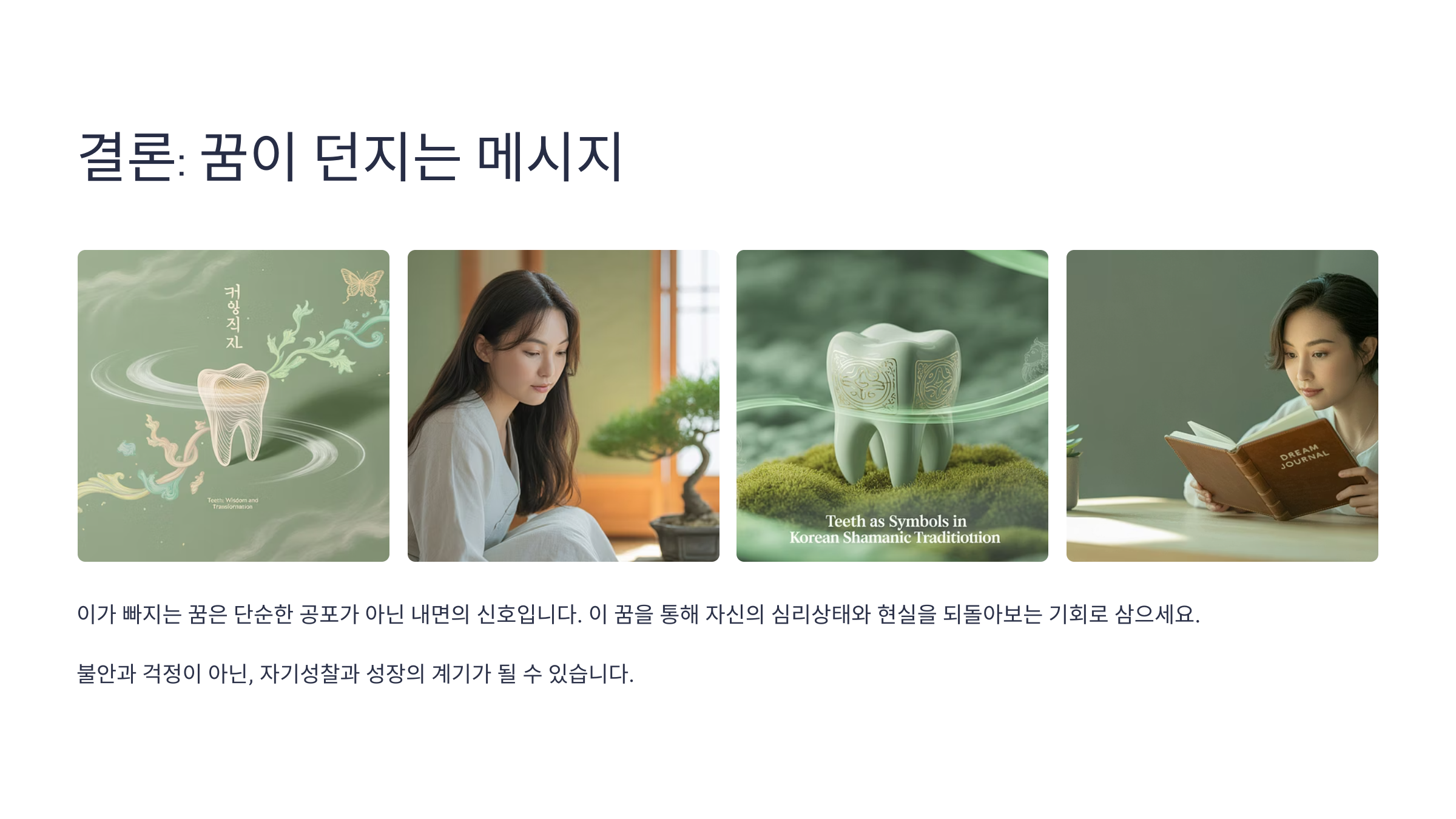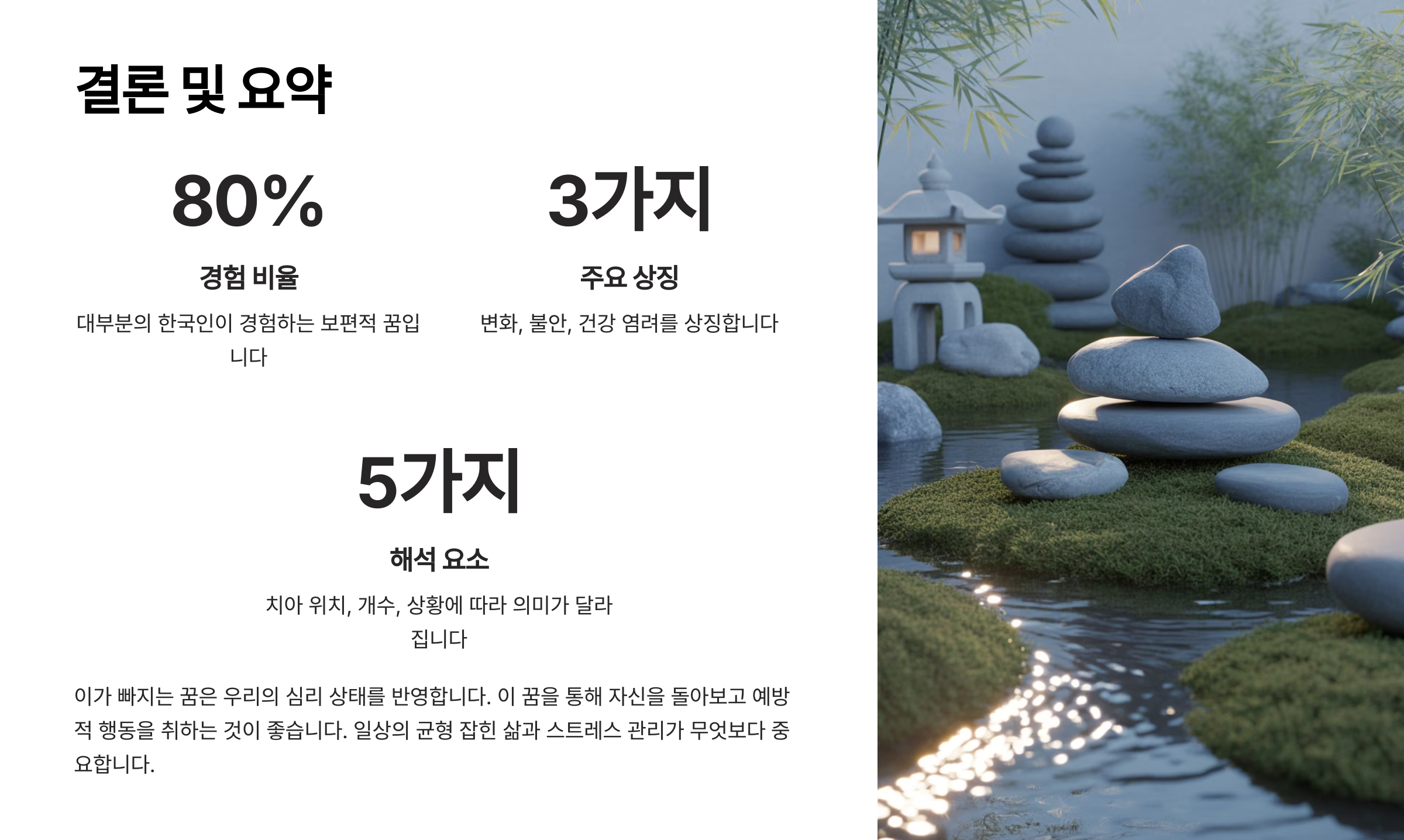 꿈은 내 마음의 상태를 알려주는 신호등 같아요. 이가 빠지는 꿈을 통해 내 심리와 건강을 점검해보면 더 건강한 삶을 살 수 있을 거예요. 😊