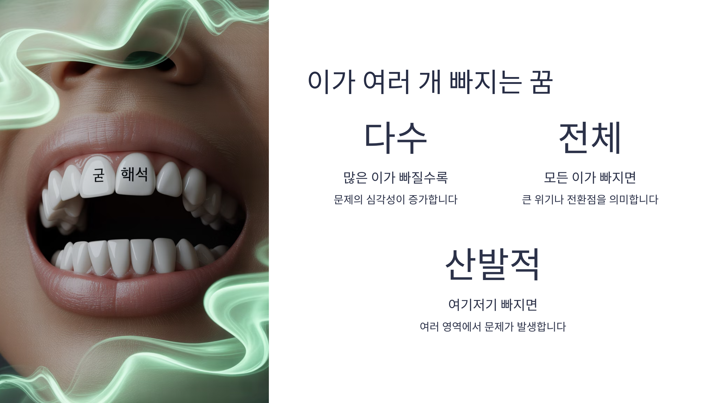 | 이가 모두 빠짐 | 큰 변화, 불안감 극대화 | 새 출발 기회 |