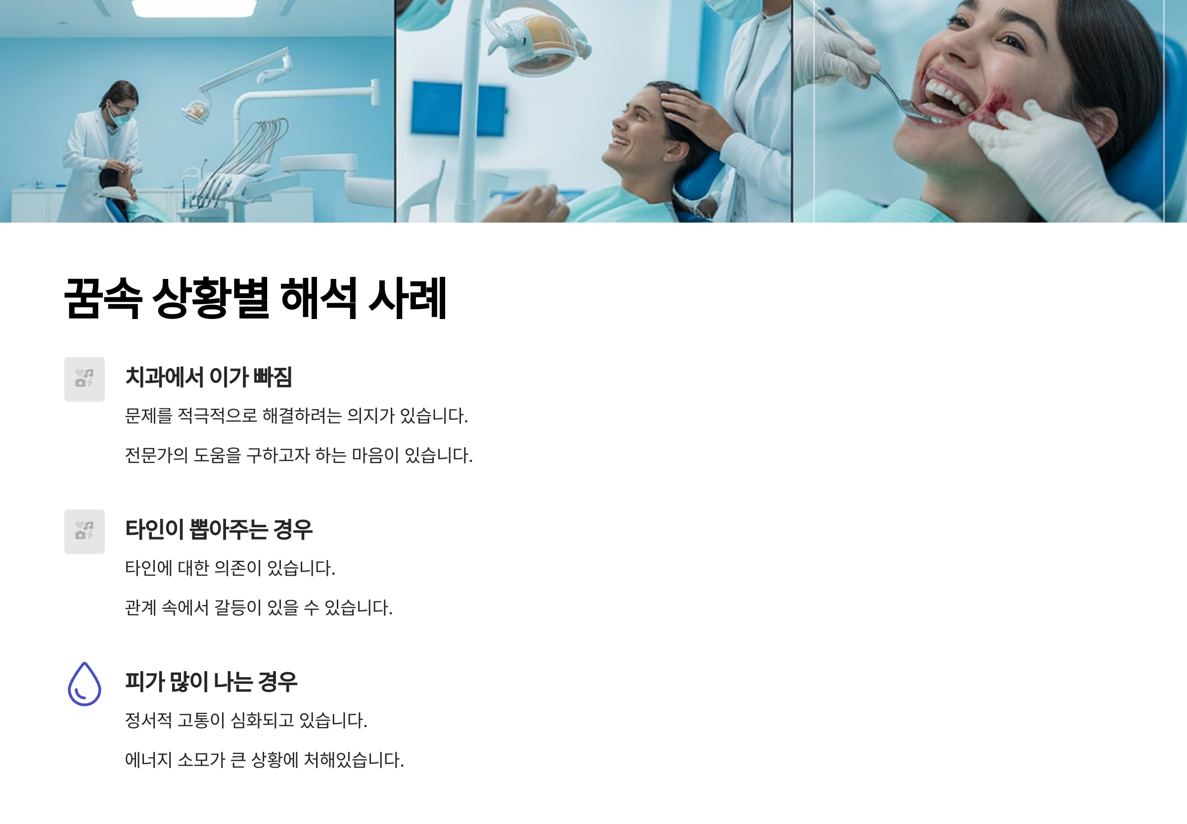 | 이가 다 빠지는 꿈 | 심한 불안, 대인관계 단절 | 스트레스 주의 |
