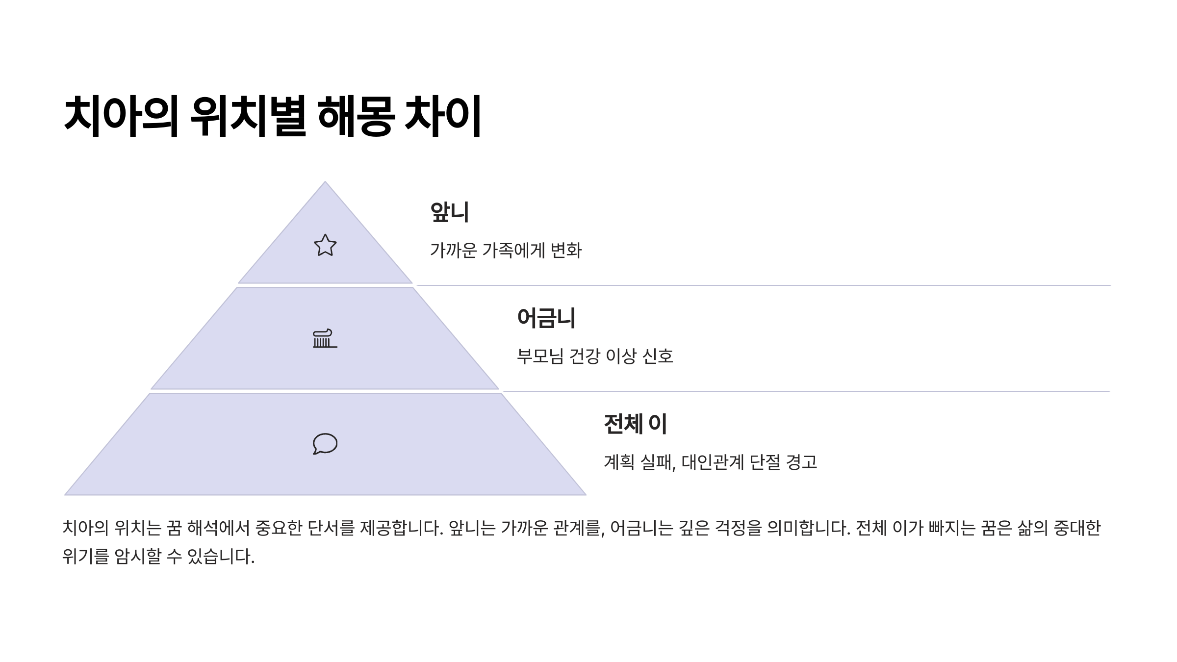 특히 앞니가 빠지는 꿈은 대인관계나 가족과의 갈등, 혹은 자신감 저하를 의미하는 경우가 많아요. 반면 어금니가 빠지는 꿈은 재정적 문제나 건강 문제를 암시할 수도 있답니다. 각 이의 위치에 따라 해석이 달라질 수 있으니 참고해 보면 좋아요!