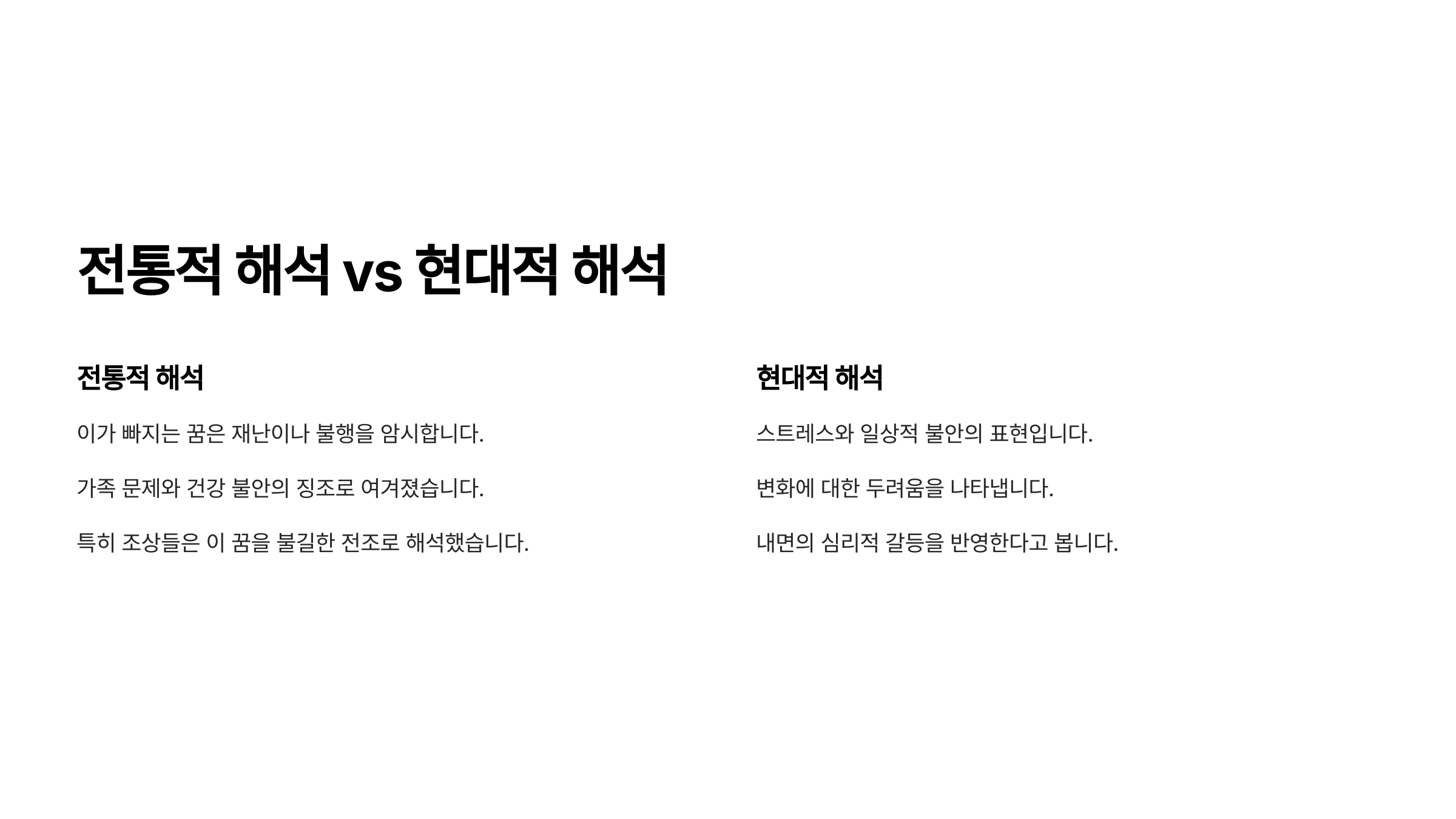 이가 빠지는 꿈은 사람마다 해석이 달라질 수 있어요. 예를 들어, 이가 한두 개 빠지는 꿈은 작은 스트레스나 고민을 나타내기도 하고, 모든 이가 다 빠지는 꿈은 큰 불안이나 변화에 대한 두려움을 상징하기도 해요. 😯