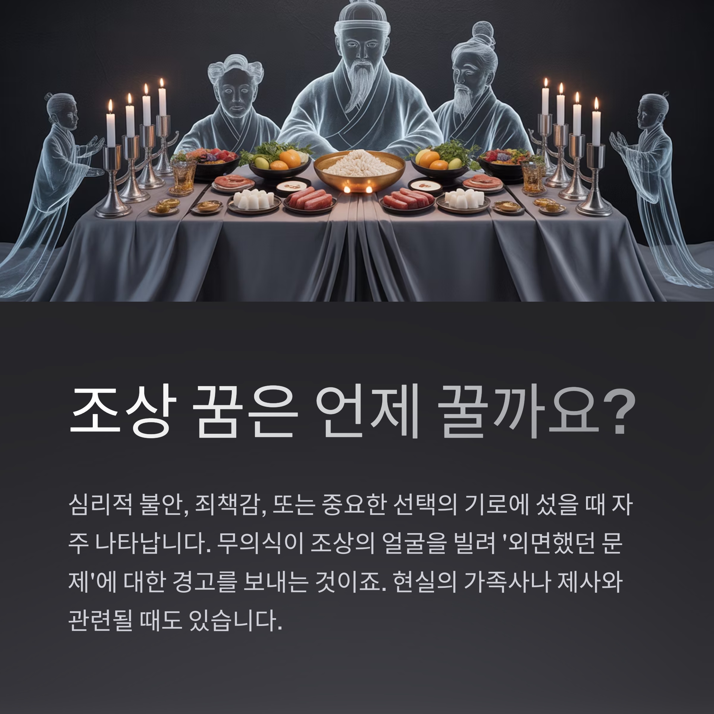 조상 꿈은 심리적 불안정, 죄책감, 혹은 중요한 선택의 기로에 설 때 자주 나타납니다. 특히 혼나는 꿈은 꿈을 꾸는 이의 내면에 '알고도 외면했던 문제'가 있을 가능성이 큽니다. 무의식은 그런 상황에서 조상의 얼굴을 빌려 경고 메시지를 던지곤 하지요.