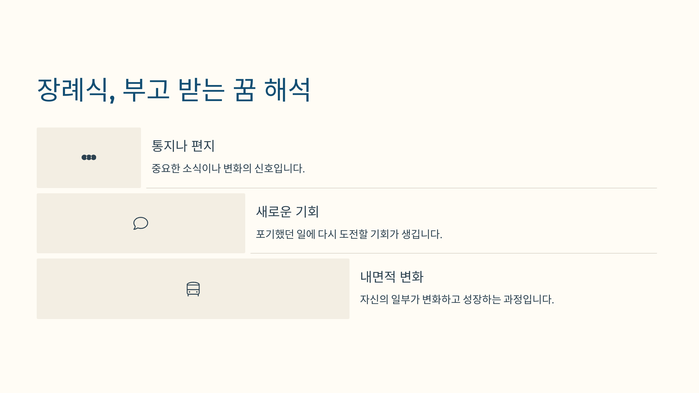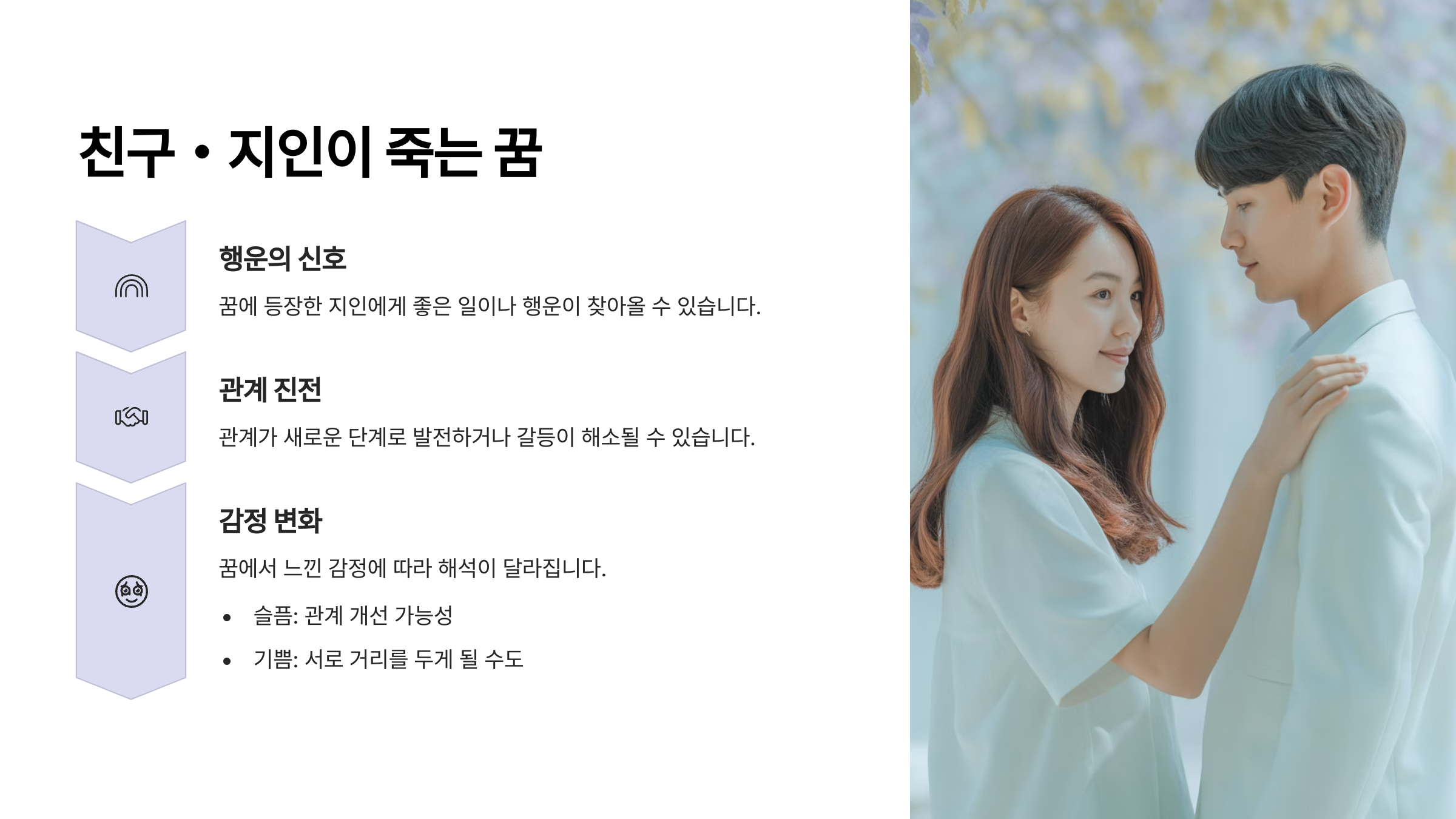 | 가족/친구 죽는 꿈 | 관계 변화 | 대화로 관계 확인 |