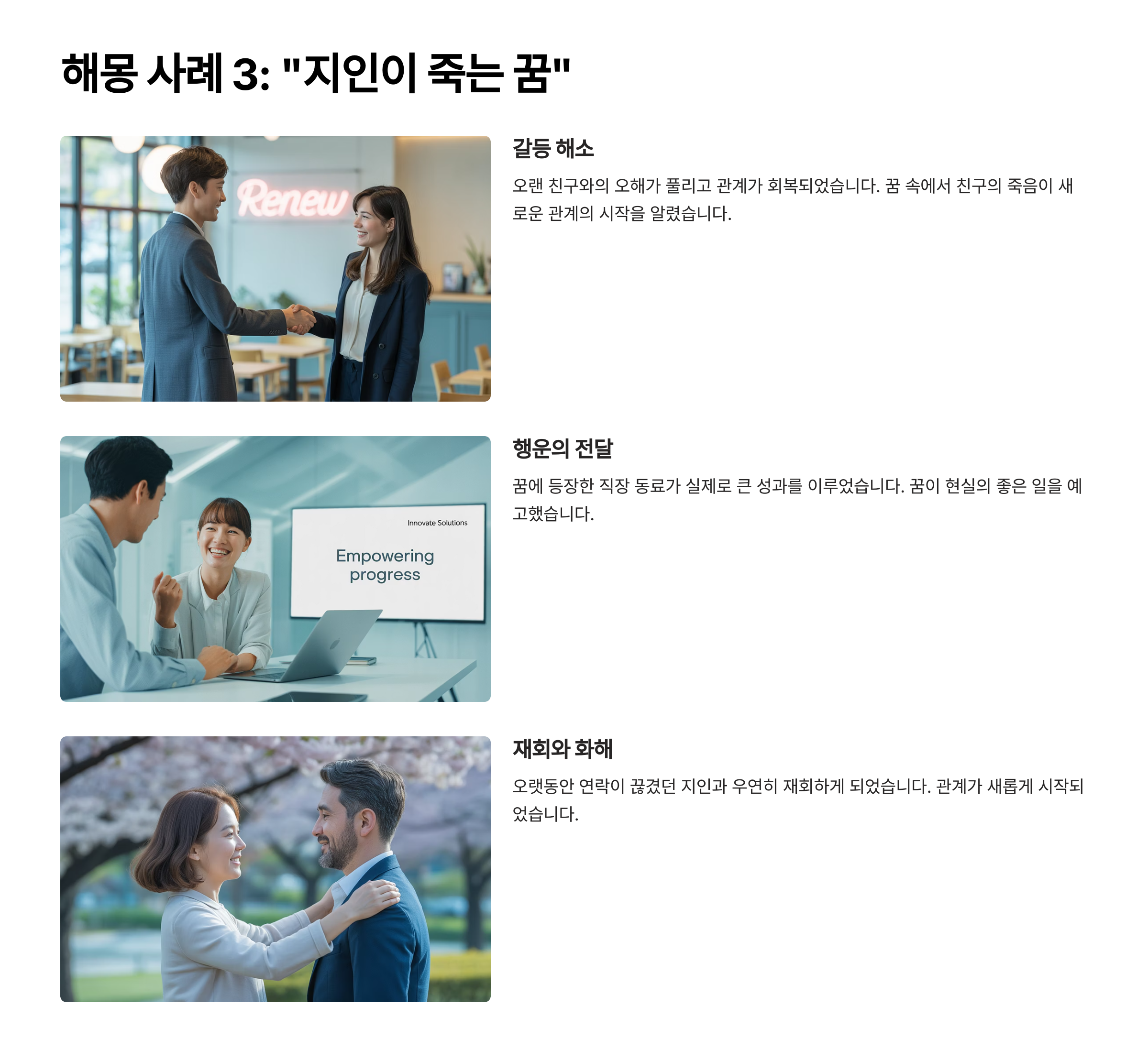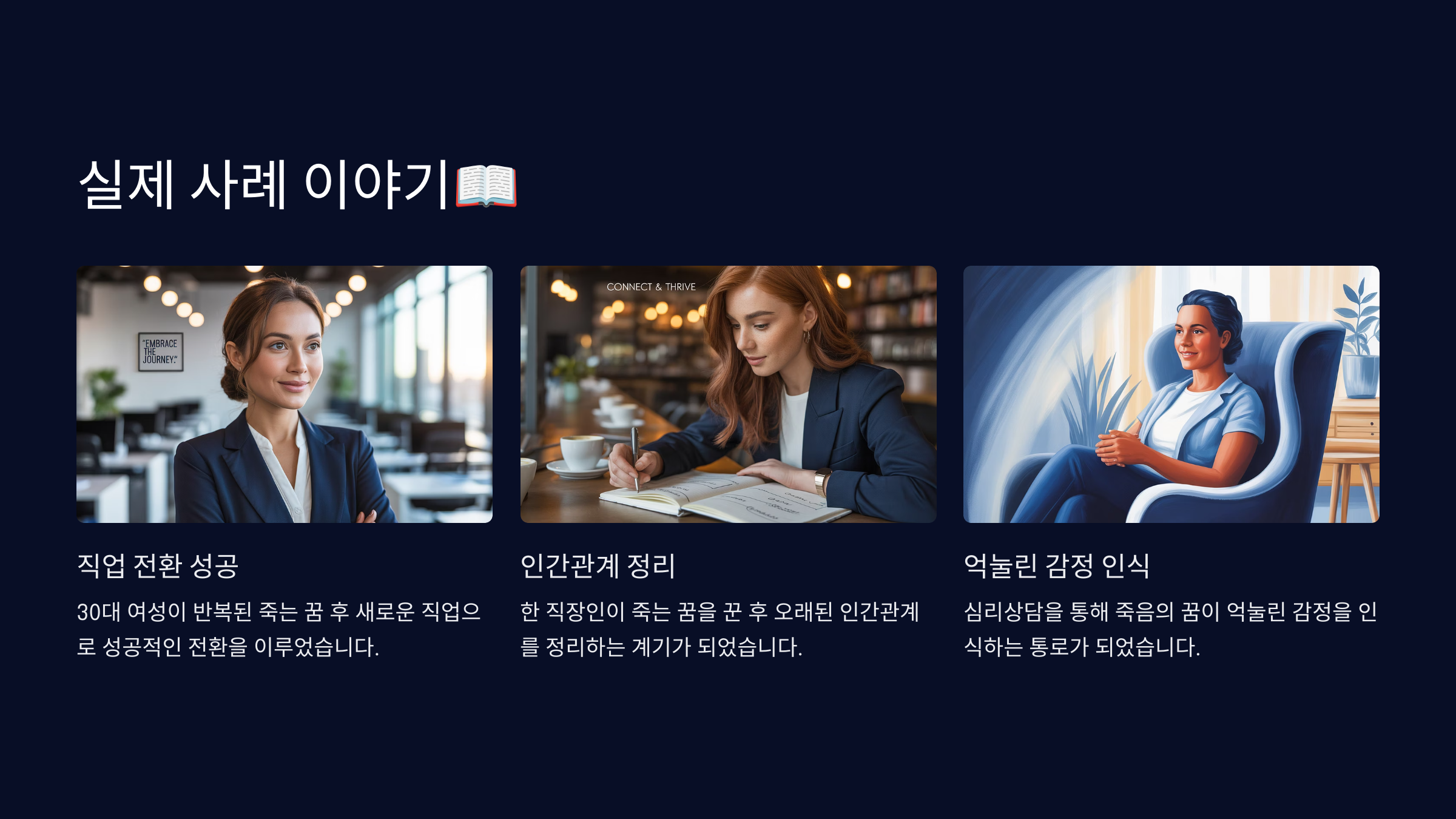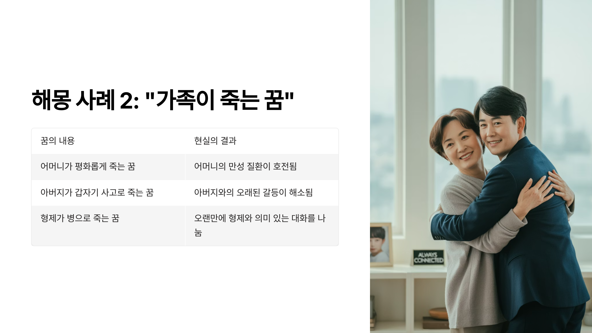 또 다른 사례로, 직장을 옮기려 고민하던 분이 꿈에서 직장 동료가 죽는 꿈을 꾸었는데, 이후 실제로 부서 이동이 이뤄져서 새로운 환경에서 좋은 성과를 내게 됐다고 해요. 꿈이 현실로 이어지는 경우도 있다는 게 참 신기하죠?