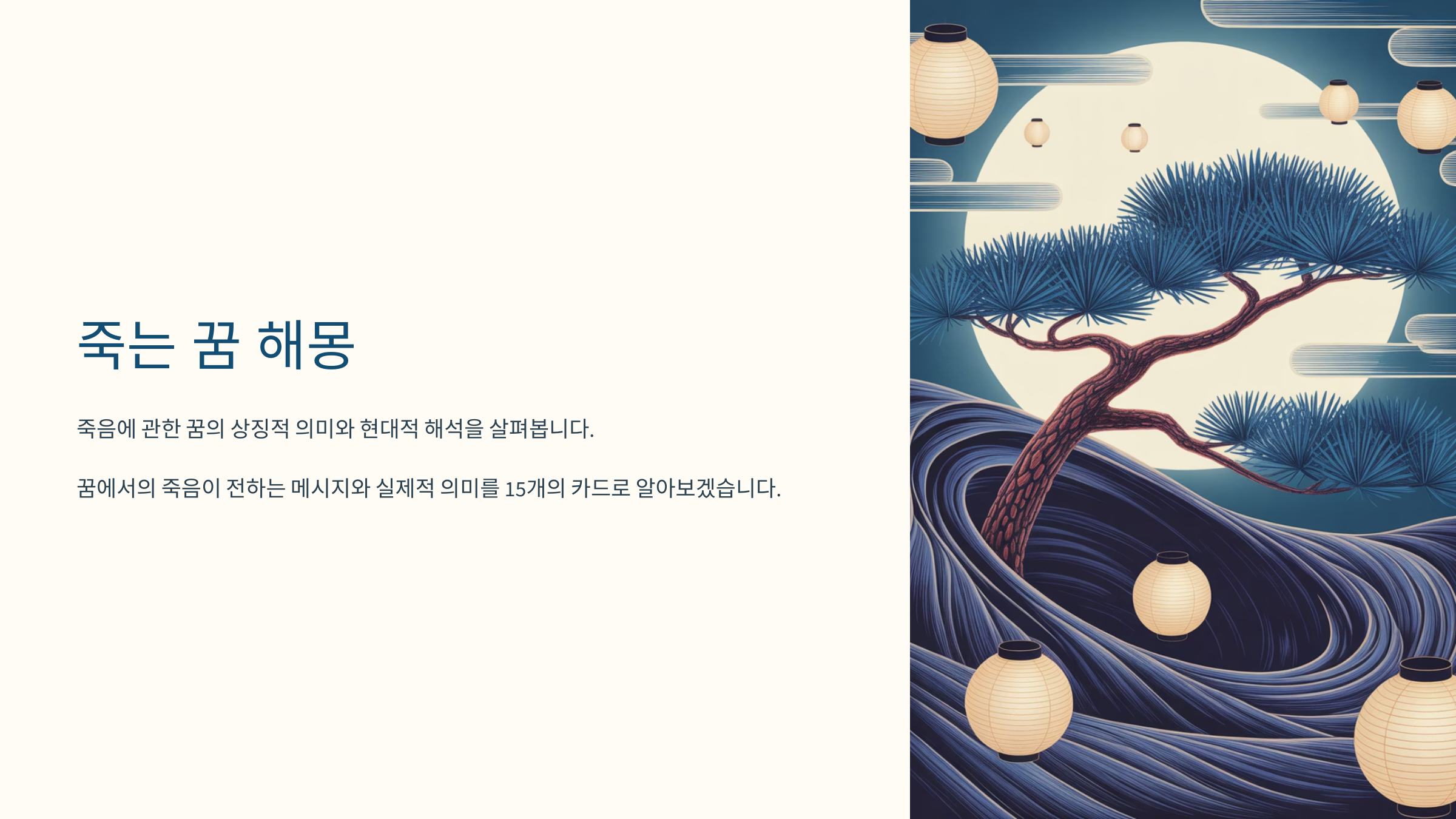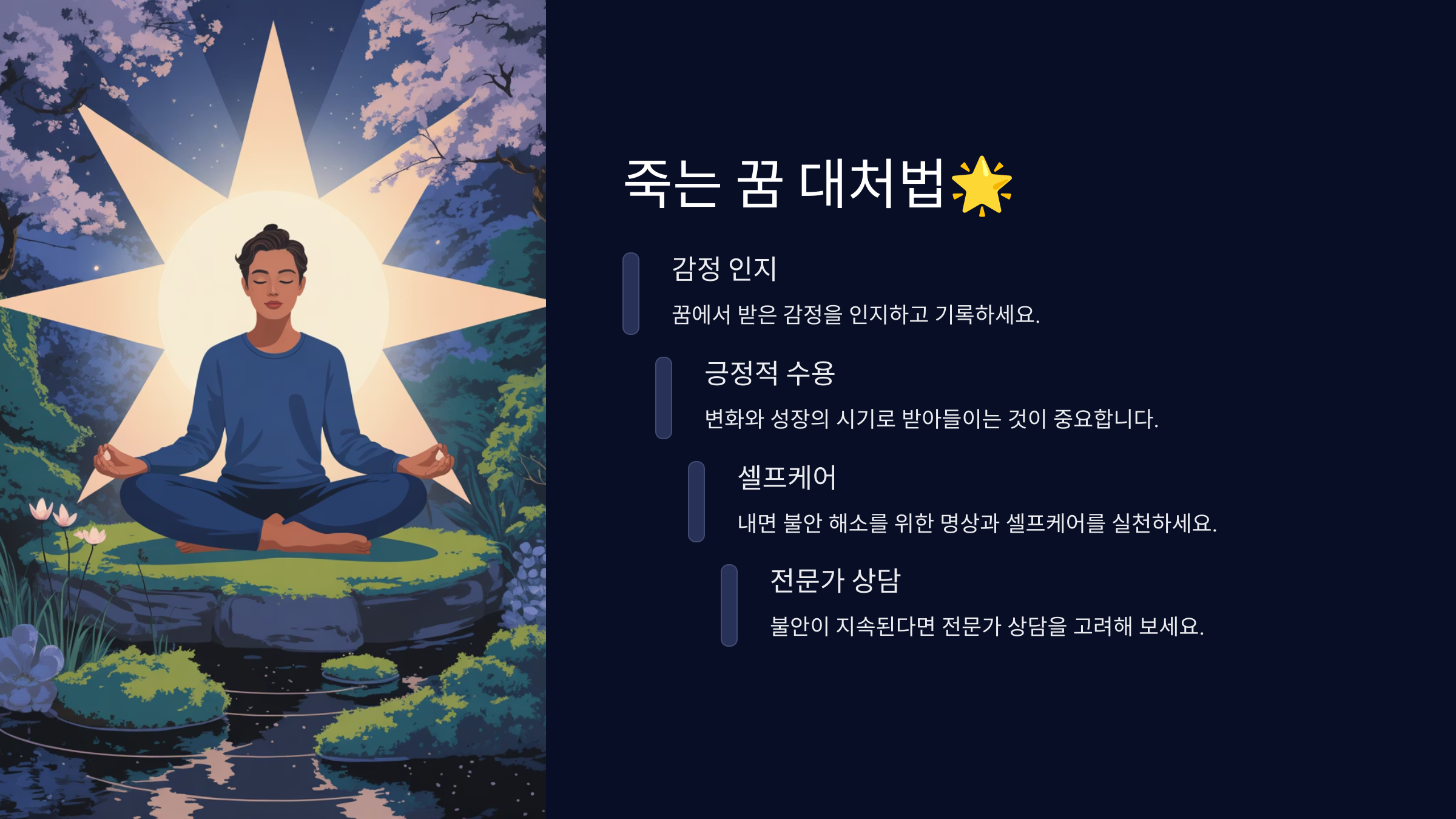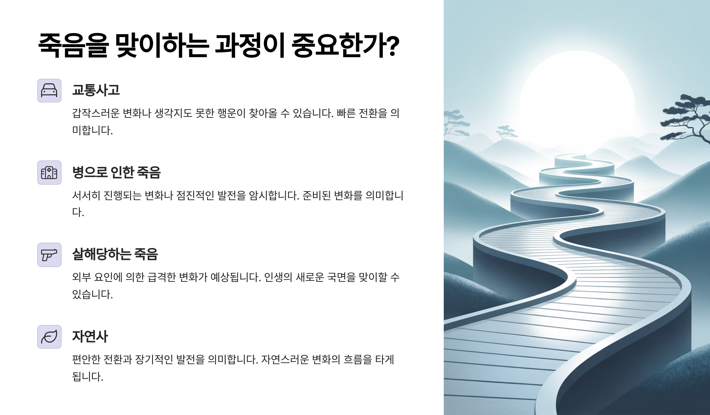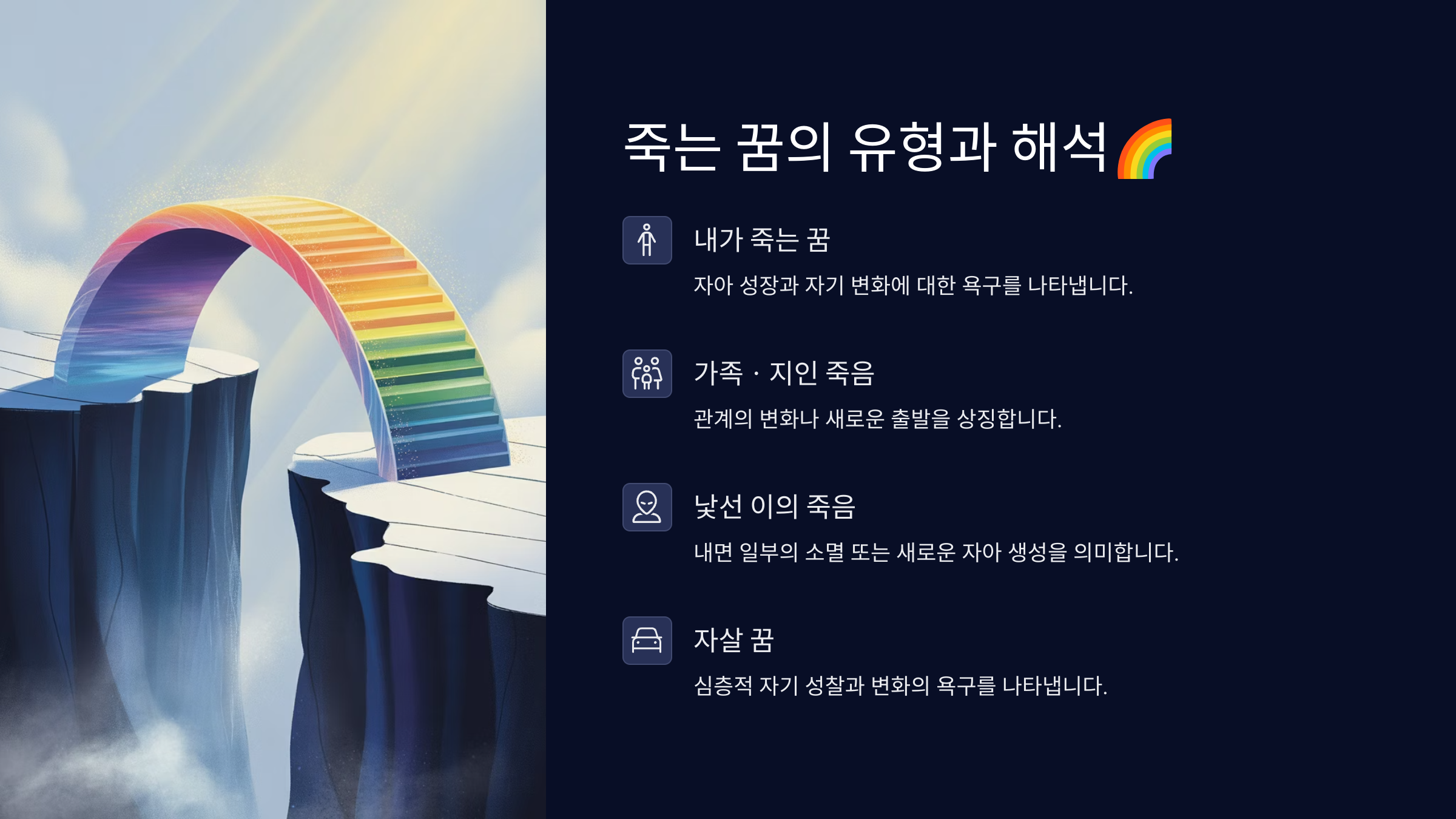 이처럼 꿈에서 죽음은 단순한 두려움만 주는 게 아니라, 새로운 기회와 성장의 문을 열어주는 역할을 하기도 해요. 불안해하지 말고 긍정적으로 바라보면 좋겠죠? 😊