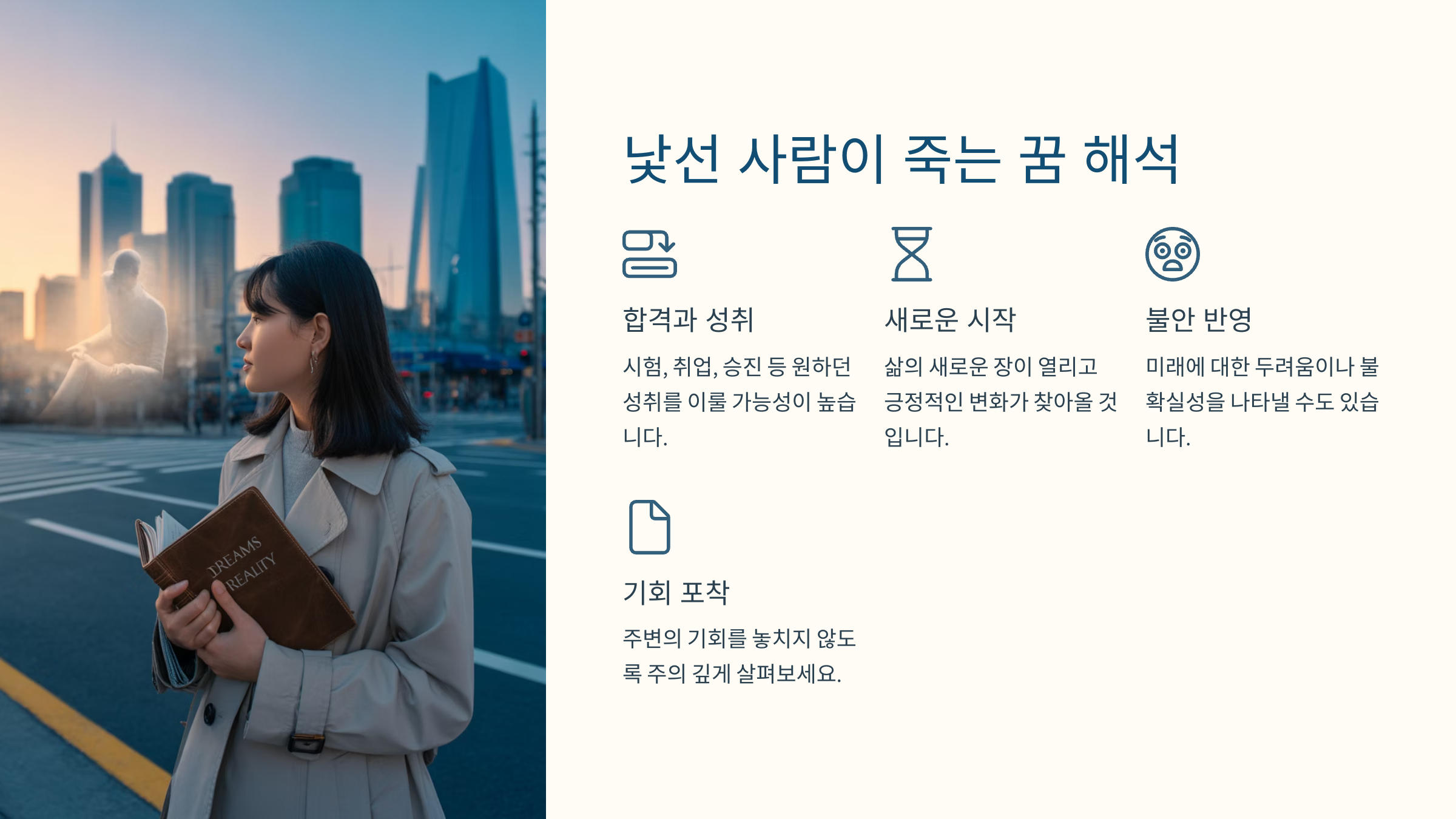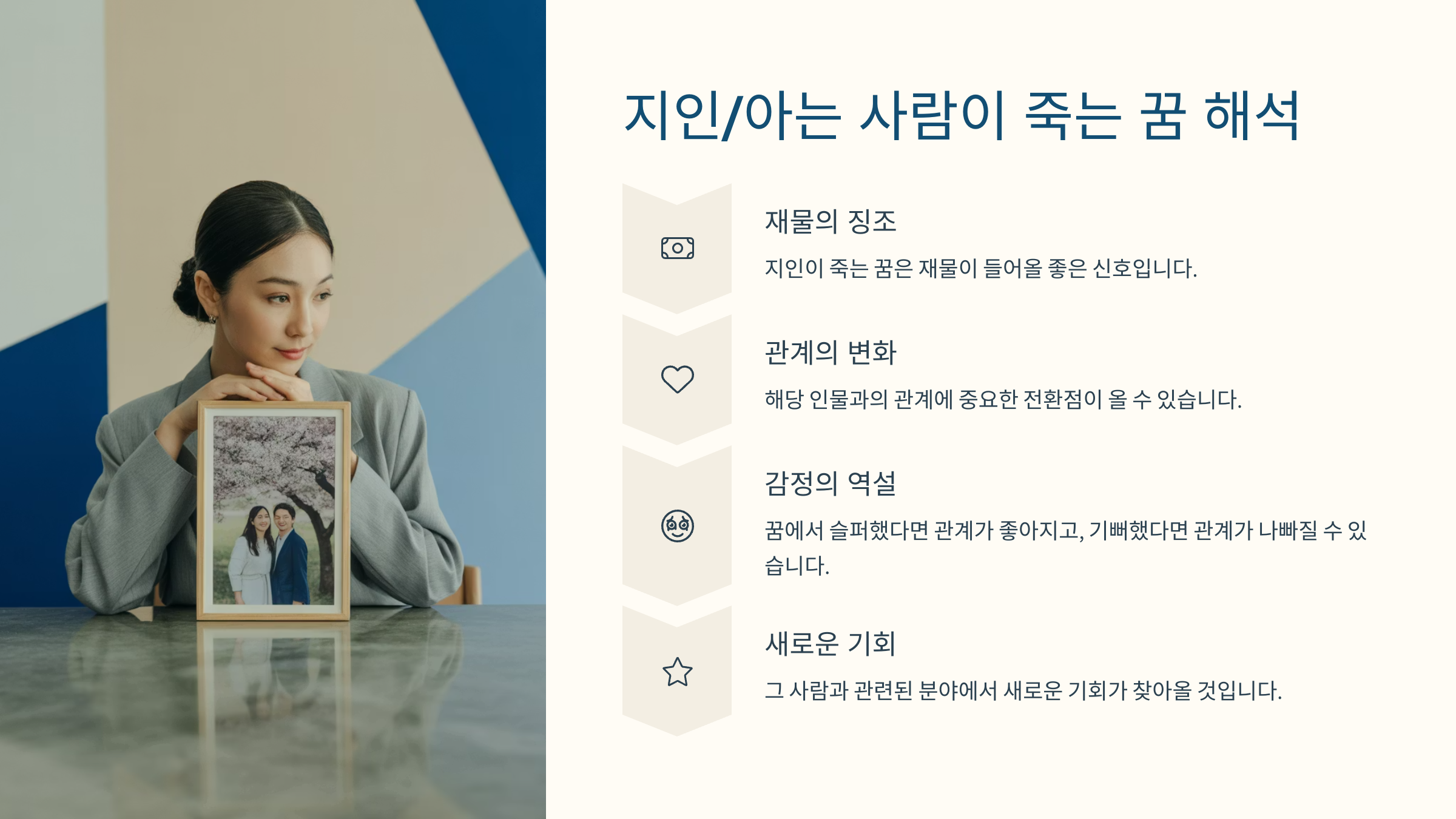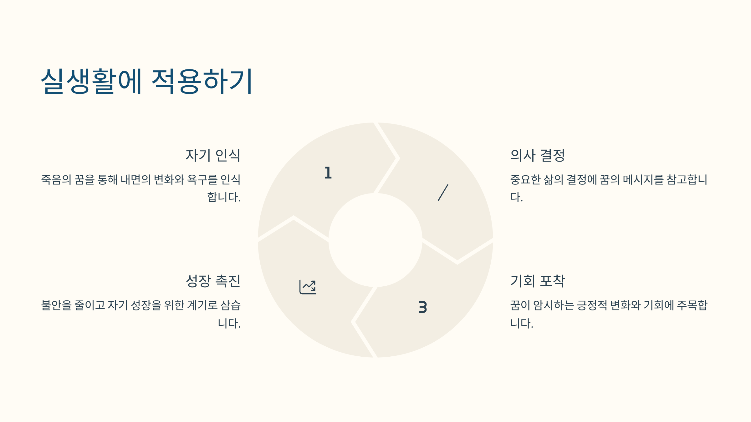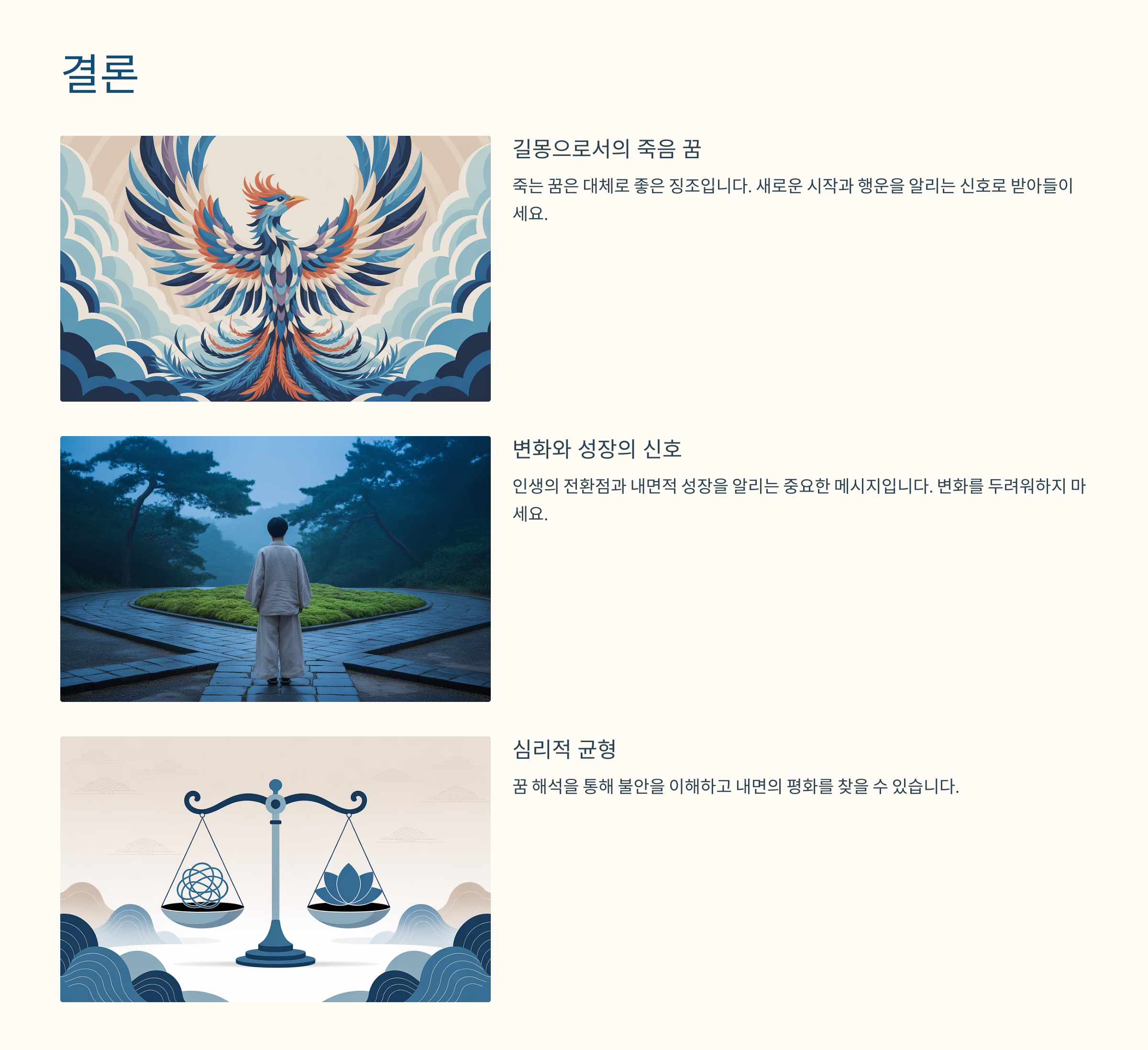 이처럼 꿈에서 죽음은 단순한 두려움만 주는 게 아니라, 새로운 기회와 성장의 문을 열어주는 역할을 하기도 해요. 불안해하지 말고 긍정적으로 바라보면 좋겠죠? 😊