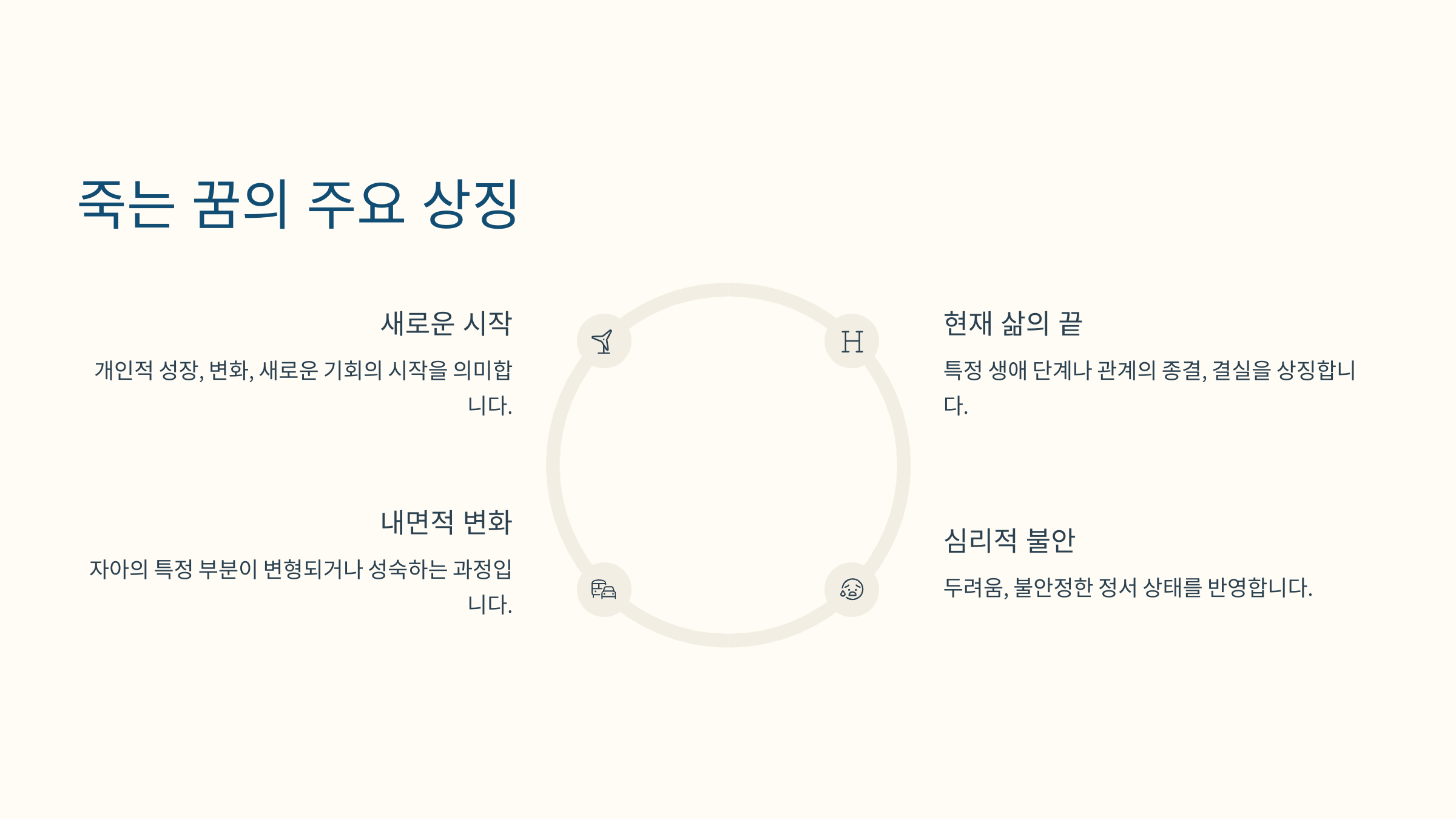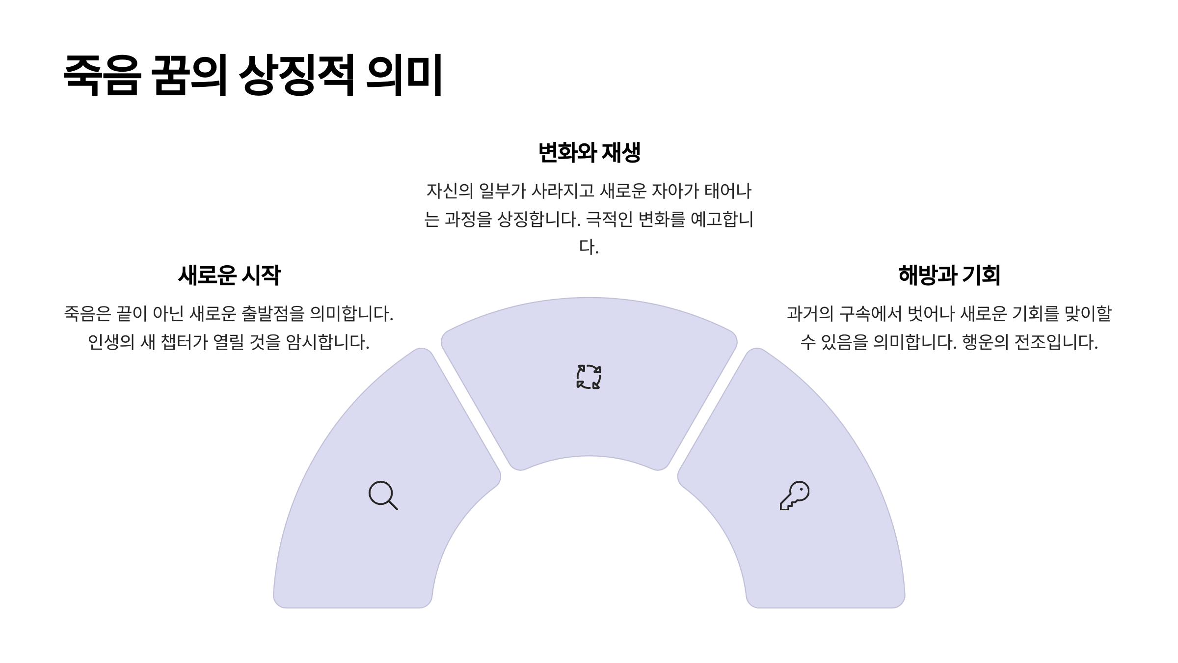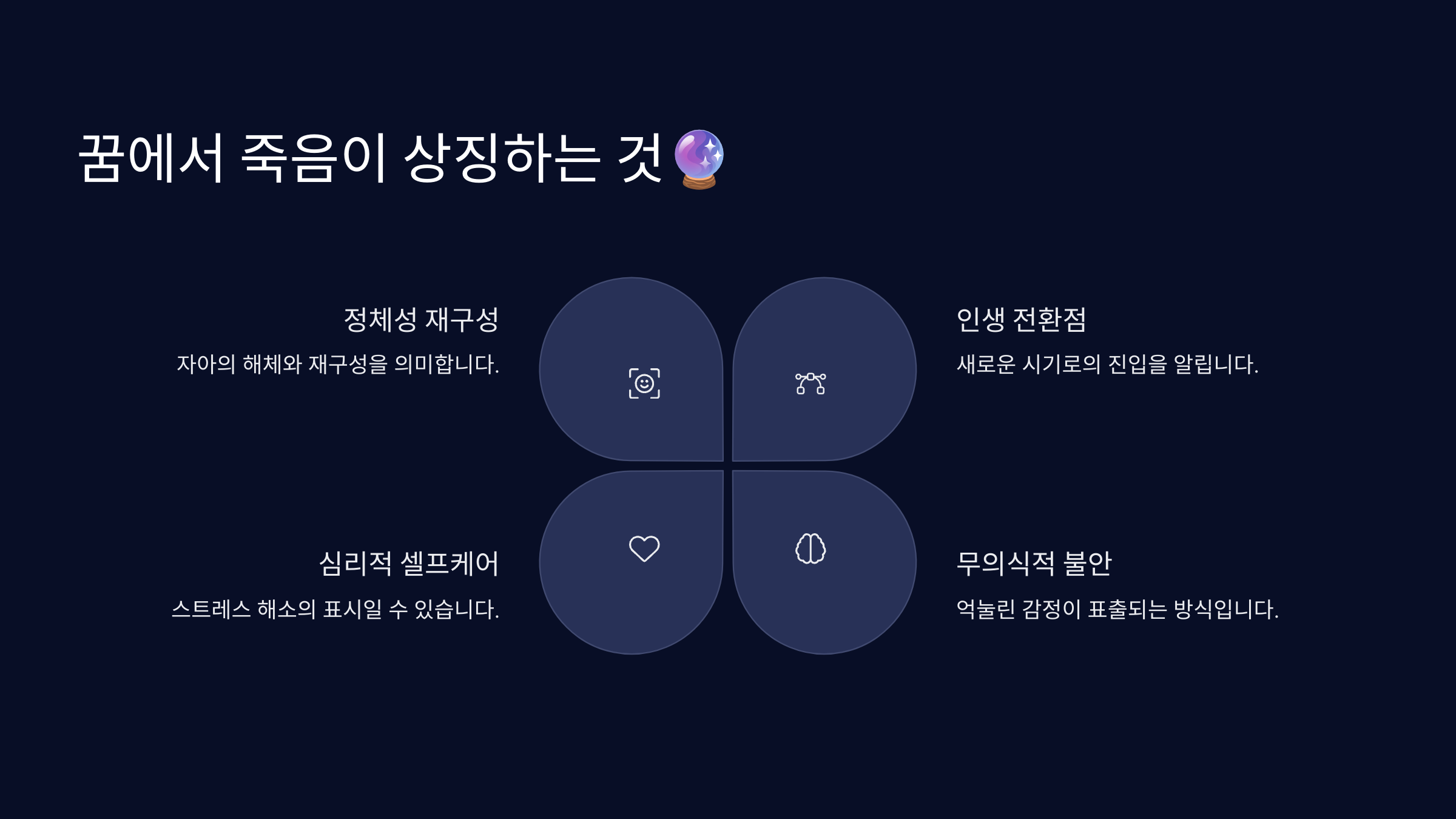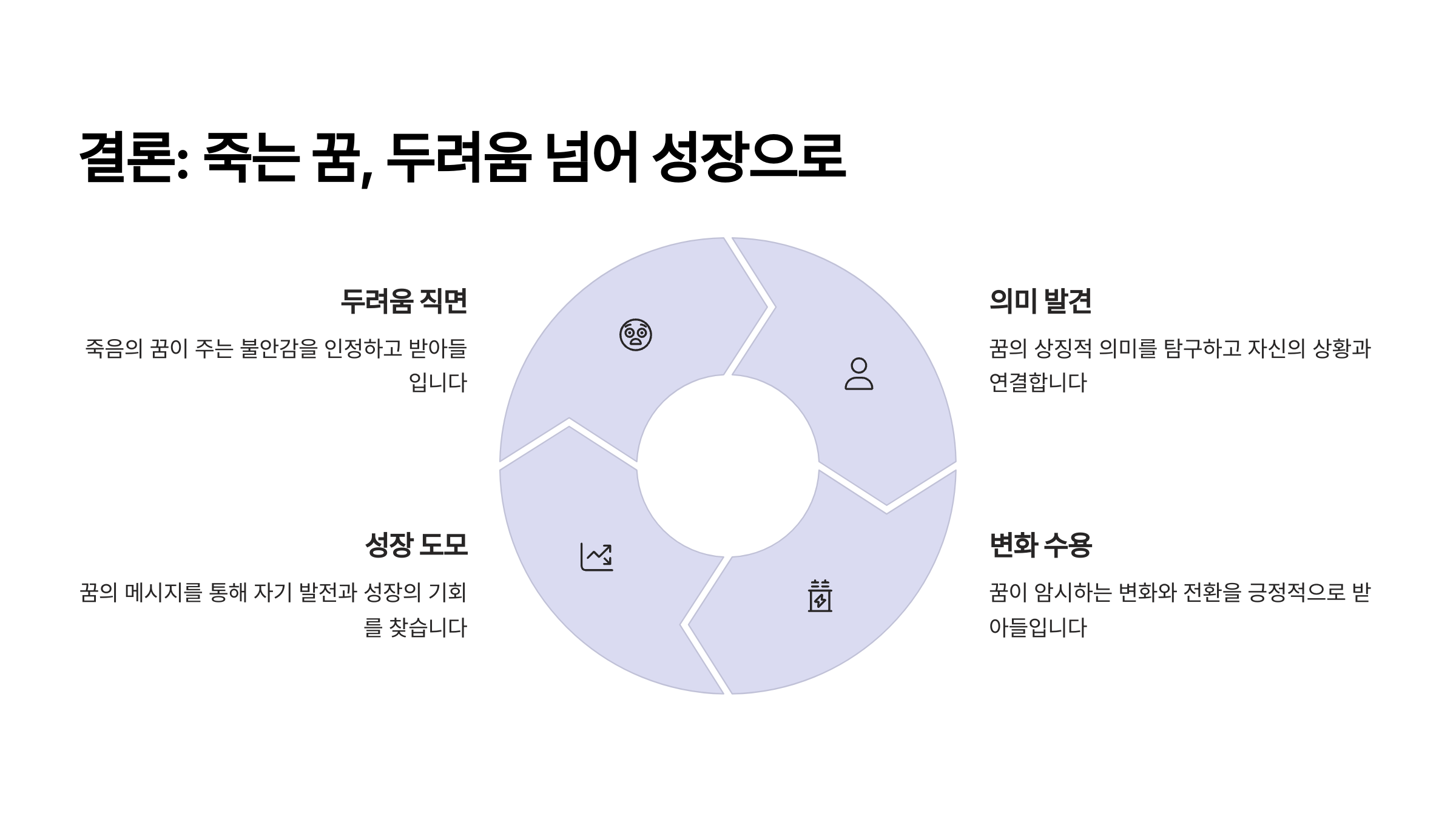 융 심리학에서는 죽음을 ‘자아의 재생’으로 해석해요. 낡은 자아를 죽이고 새로운 자아를 맞이하는 과정으로, 심리적 성장을 암시하는 긍정적인 신호로도 볼 수 있답니다.