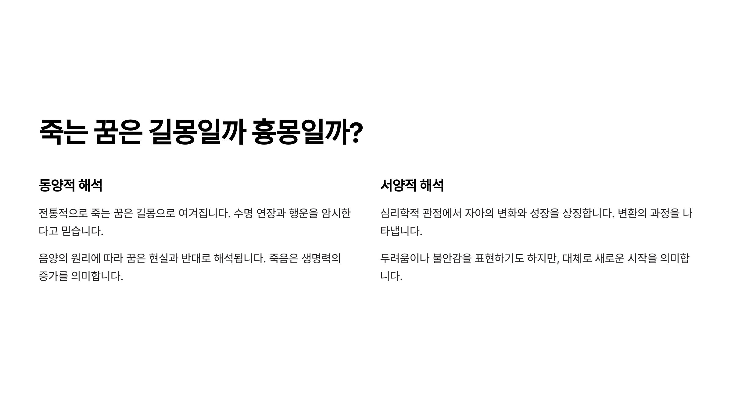| 사례1 | 본인이 죽는 꿈 | 시험 합격, 자신감 상승 |