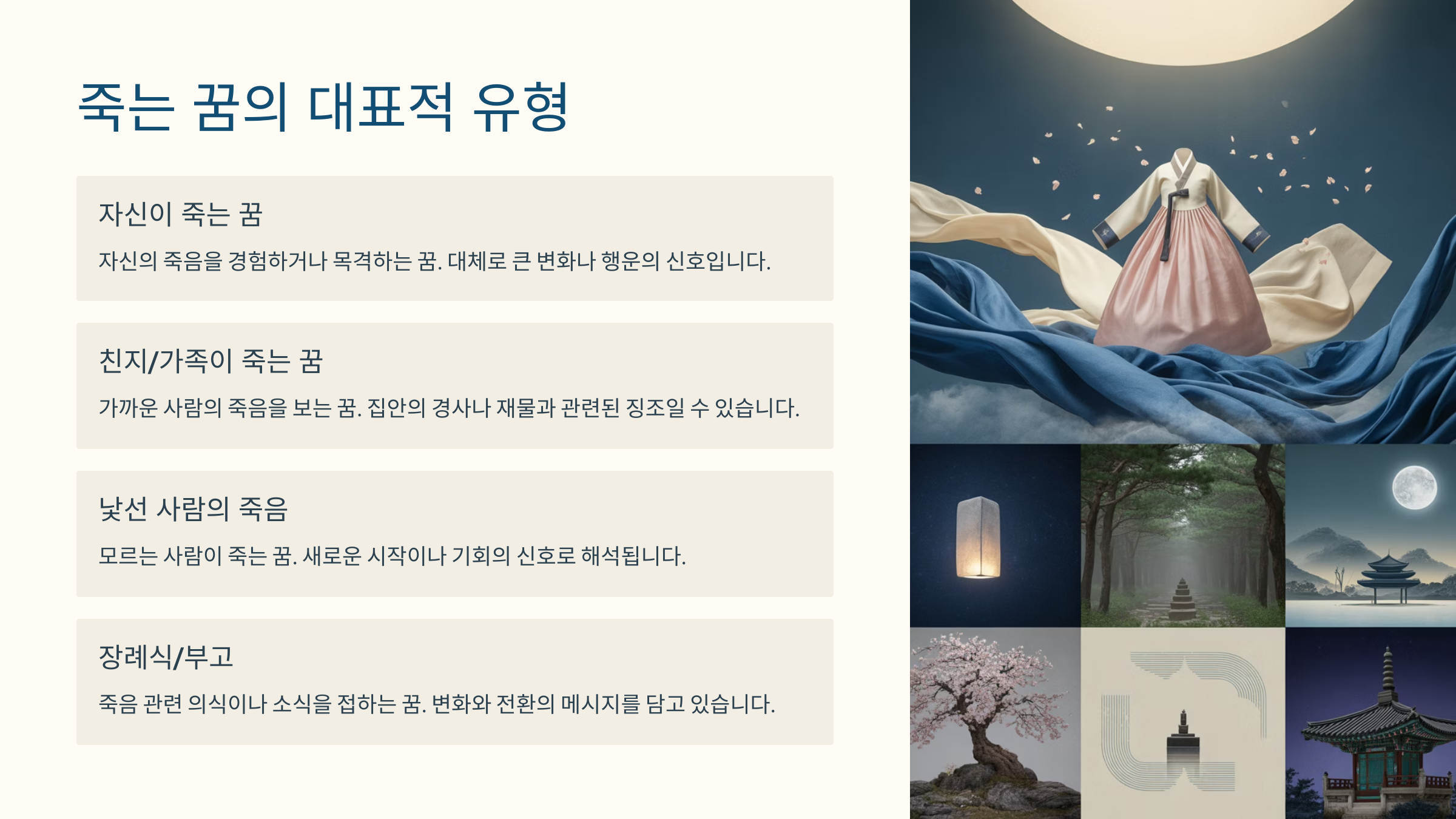 죽는 꿈이라고 해서 모두 같은 의미를 갖는 건 아니에요. 꿈에서 어떻게 죽는지, 누가 죽는지, 상황이 어떠한지에 따라 해석이 달라지거든요. 그래서 이번에는 꿈의 유형별로 죽음이 상징하는 의미를 자세히 알려줄게요.