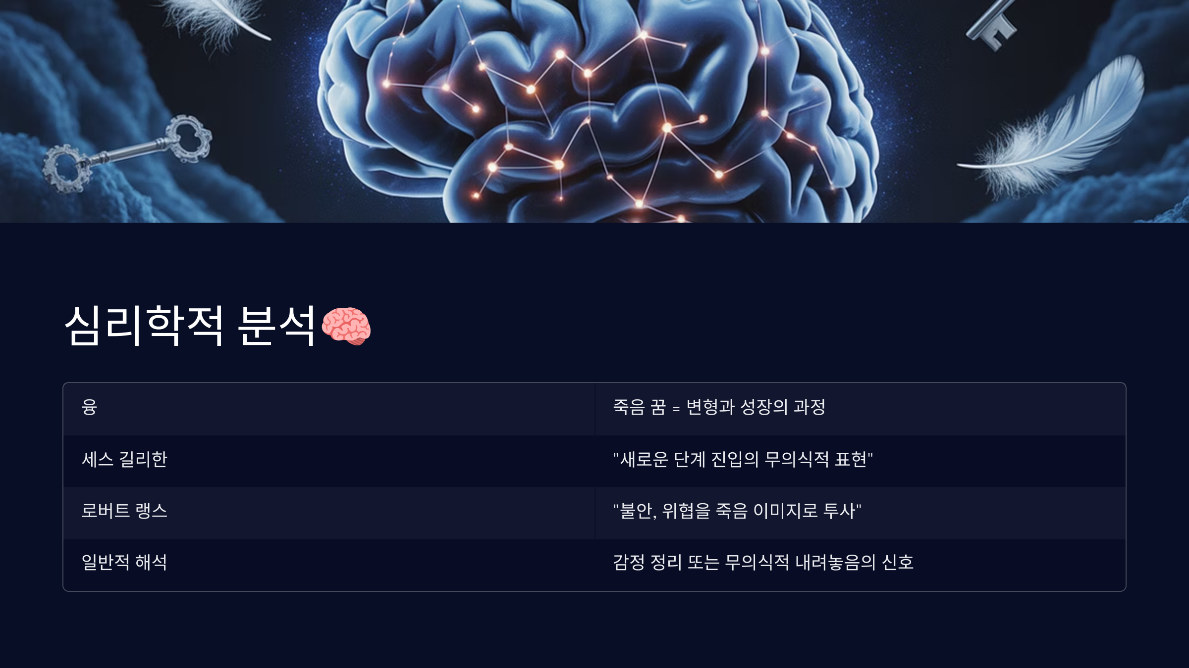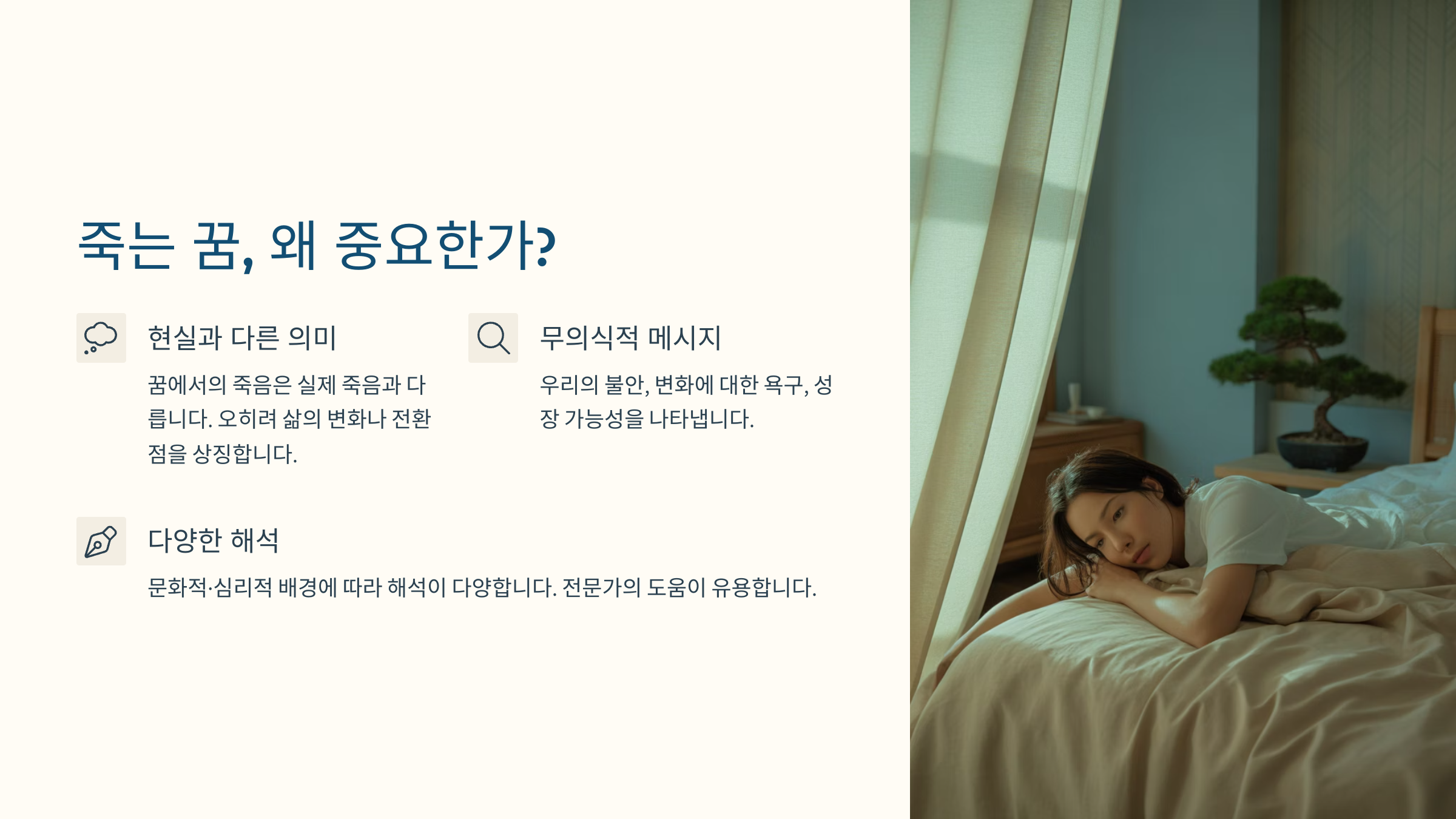 죽는 꿈의 의미부터 상징성, 꿈의 유형별 해석, 심리학적 분석, 대처법까지, 하나하나 자세히 알려줄게요! 😊