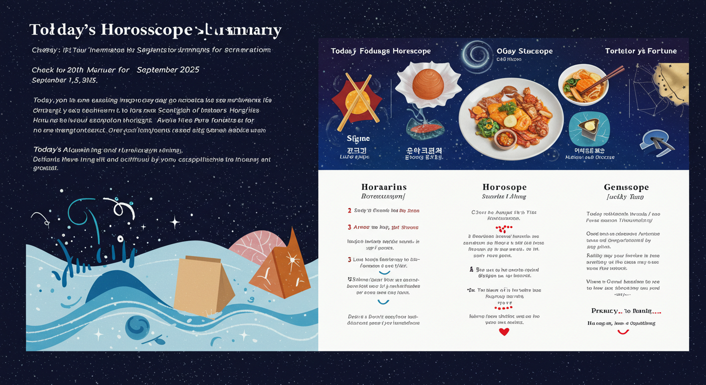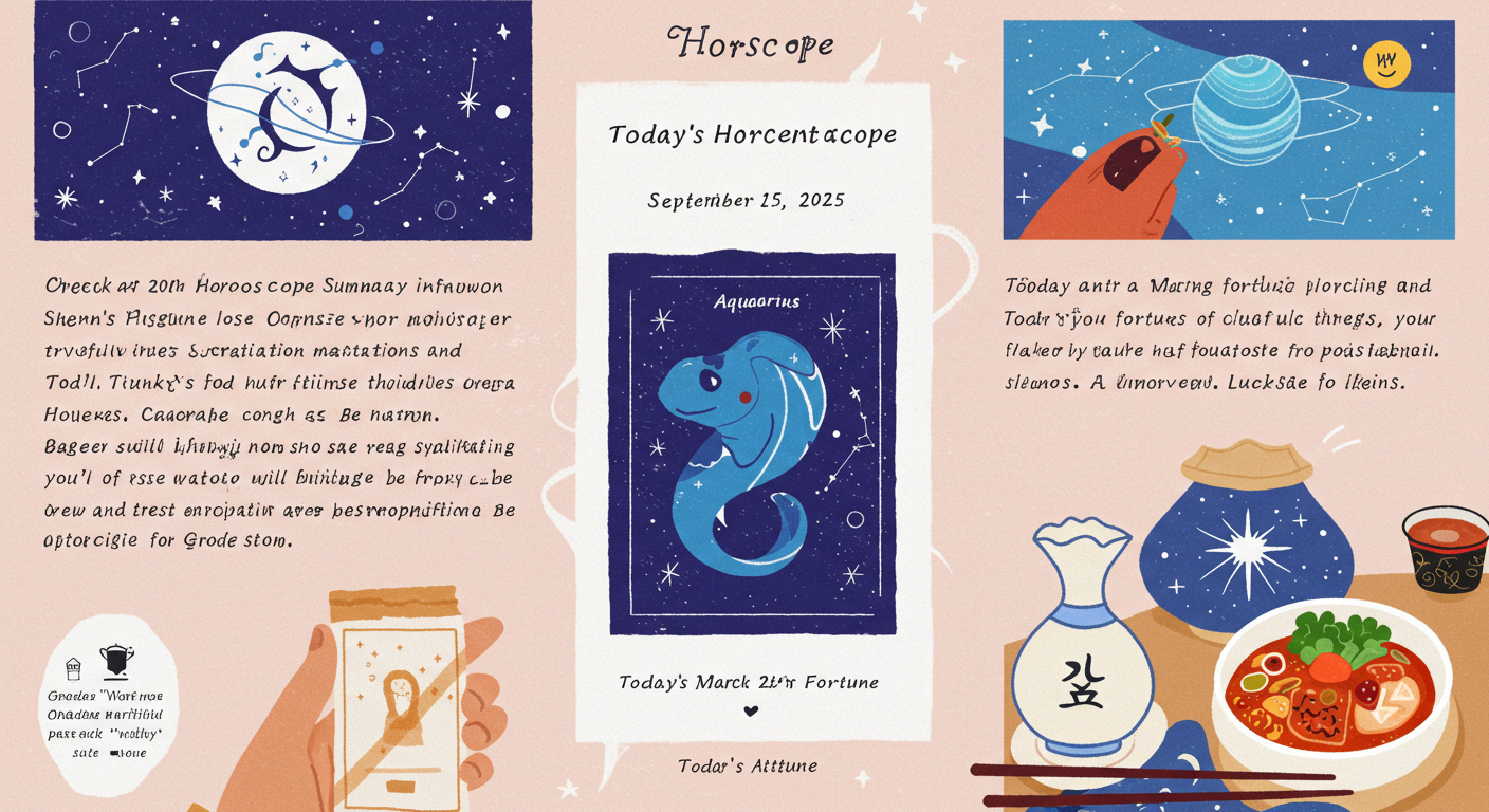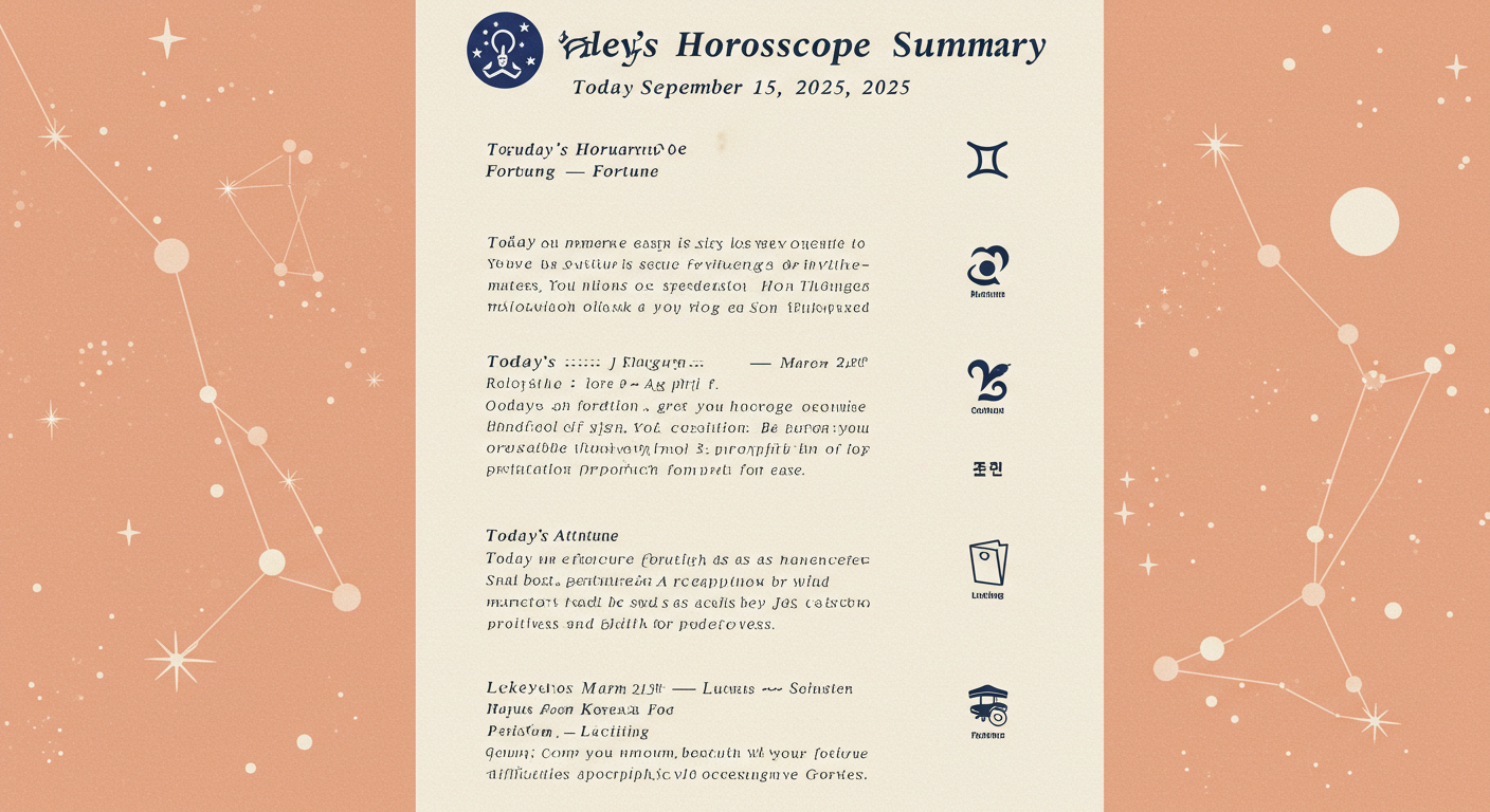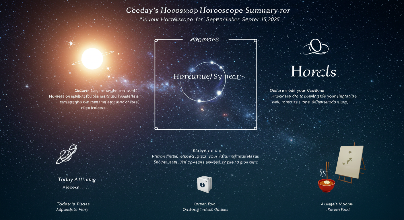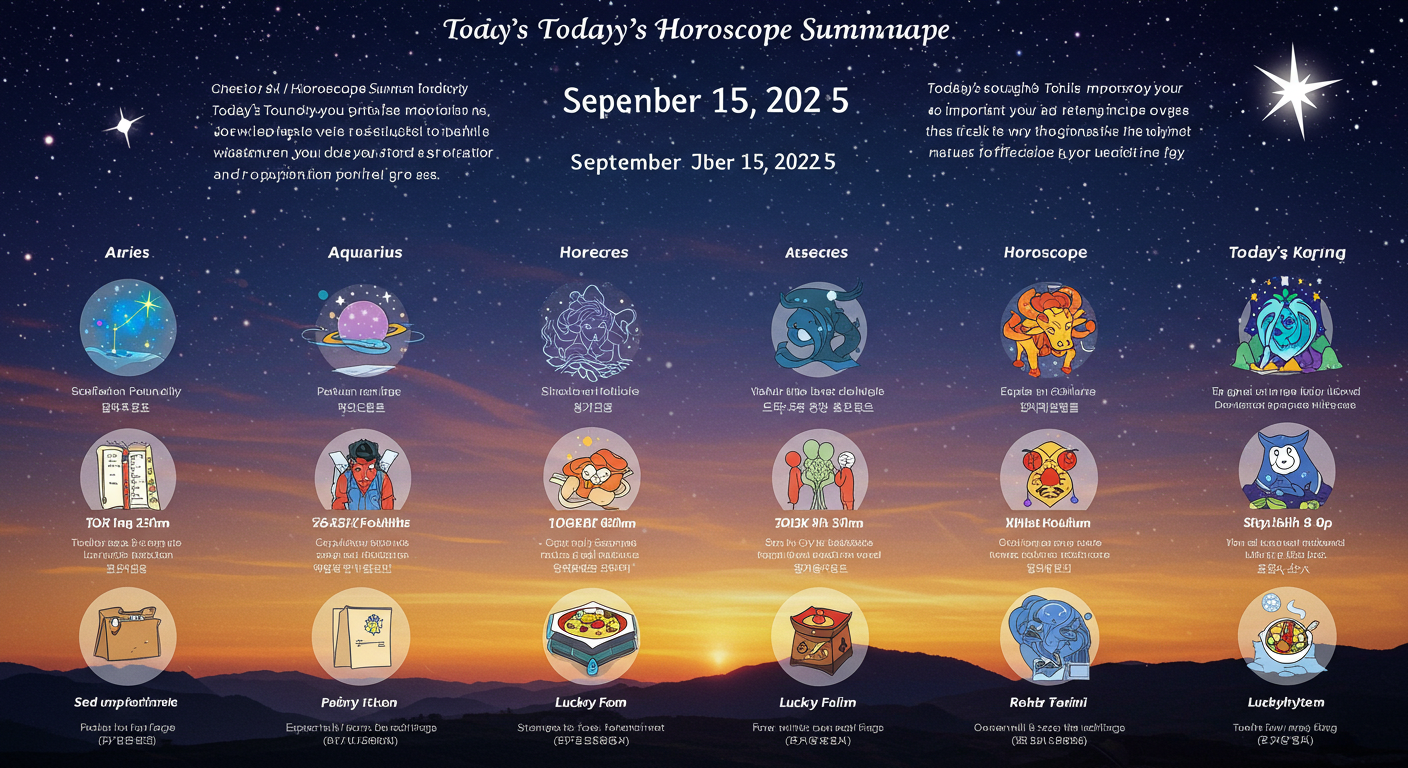 9월 15일, 오늘은 흩어진 흐름을 정리하고 내실을 다지는 것이 중요한 날이에요. 가까운 사람들과의 신뢰 회복이 필요하며, 꼼꼼함이 길을 열어주는 운세입니다. 각 별자리별 운세와 행운 아이템을 확인하며 하루를 알차게 계획해보세요.