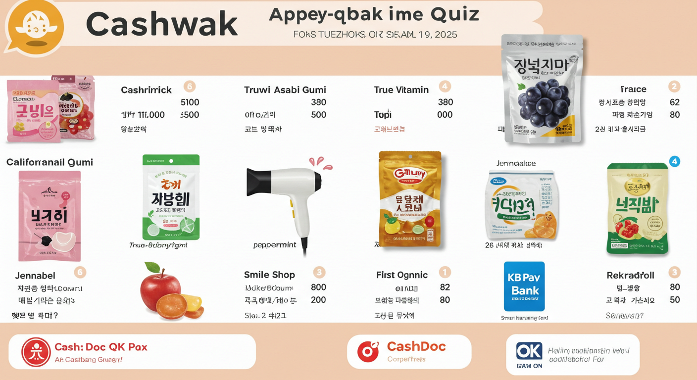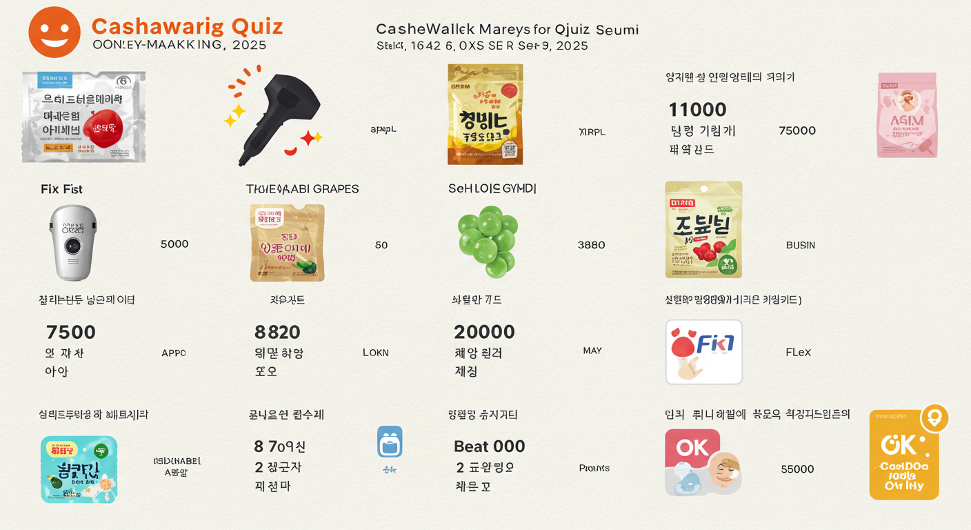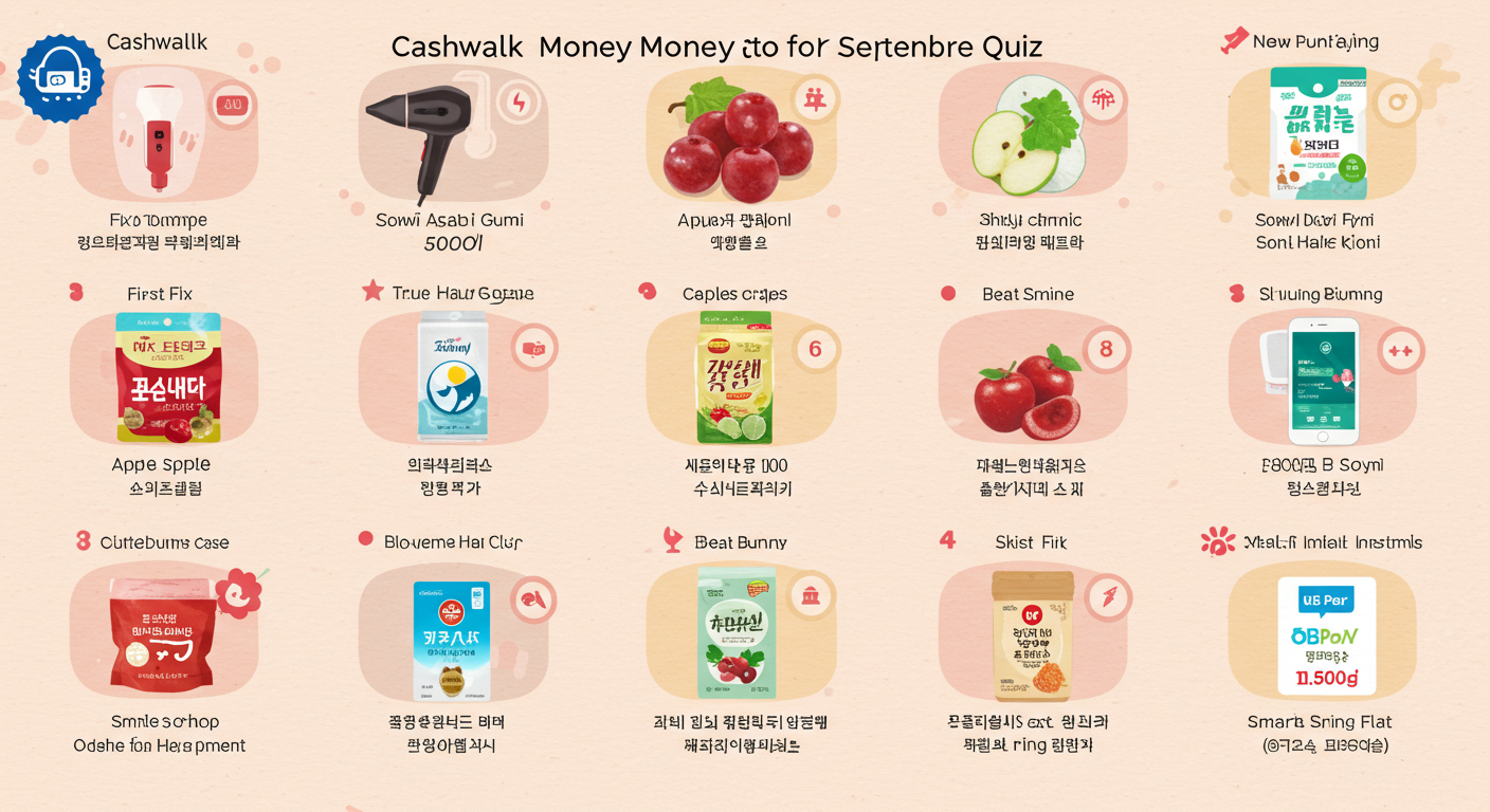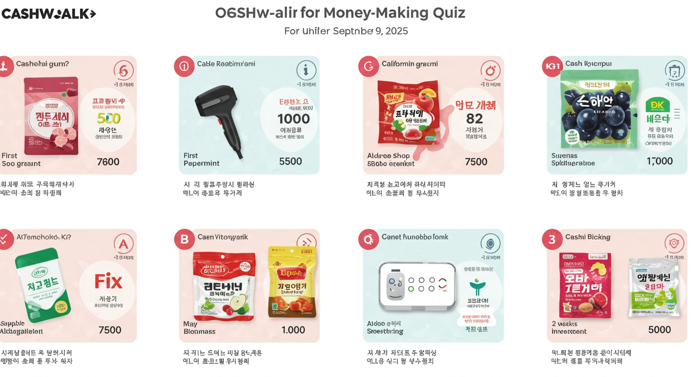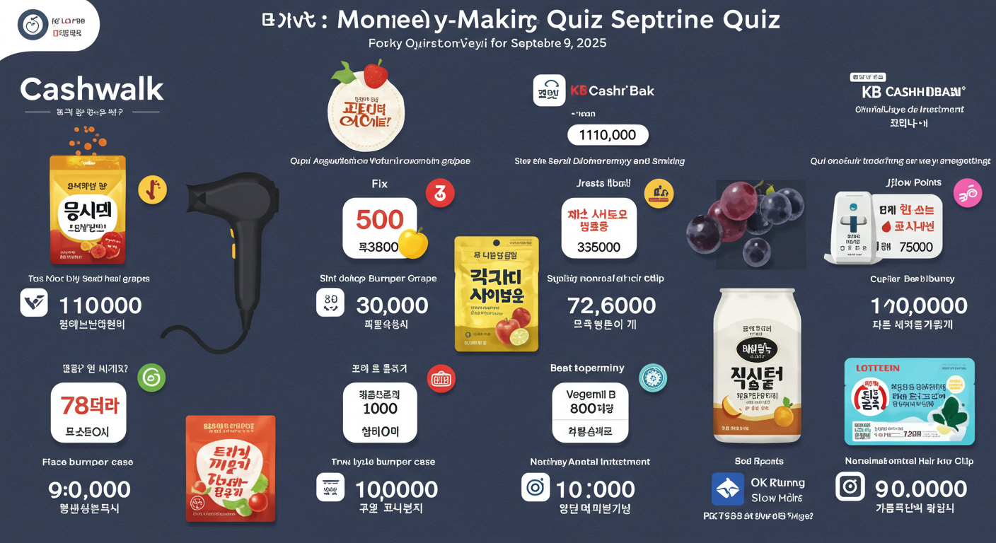 2025년 9월 9일자 다양한 앱테크 플랫폼에서 출제된 퀴즈 정답을 한곳에 모아 정리했습니다. 캐시워크, 캐시닥, 토스, OK캐쉬백, KB Pay, 신한 쏠퀴즈 등 여러 앱을 이용하시는 분들이 빠르게 확인할 수 있도록 정리했어요. 단, 정답은 운영사 사정에 따라 바뀔 수 있으니 참고용으로만 확인해 주세요.